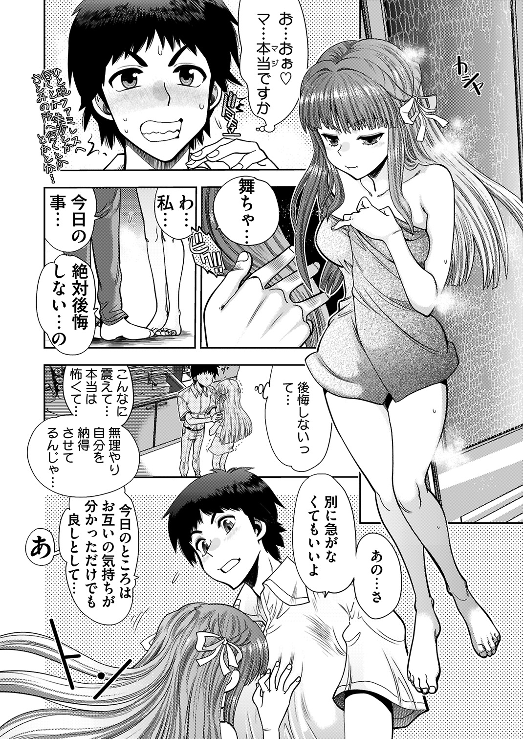 シャワーを浴びた彼女は、別に急がなくていいよと言う主人公に、「ありがとう、あなたを好きになって良かった。──私を…だ…抱いて…ください」と、嬉し涙をしながら微笑みかける。そうして初めてのキスをした二人は、ベッドで愛を確かめ合うのだった。処女喪失シーンで痛みを堪えながら、「痛い…けど…大丈夫…だから…」と嬉し涙を流す舞ちゃんの可愛さは必見♥ 膣出しされて仲良く一緒にイッちゃう二人の幸せな姿は、本誌を購入して確認しよう!!
