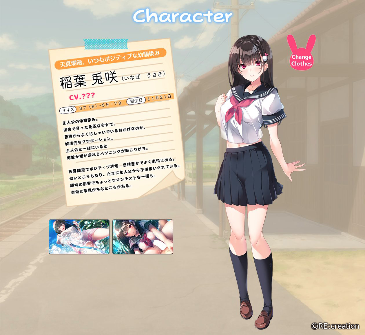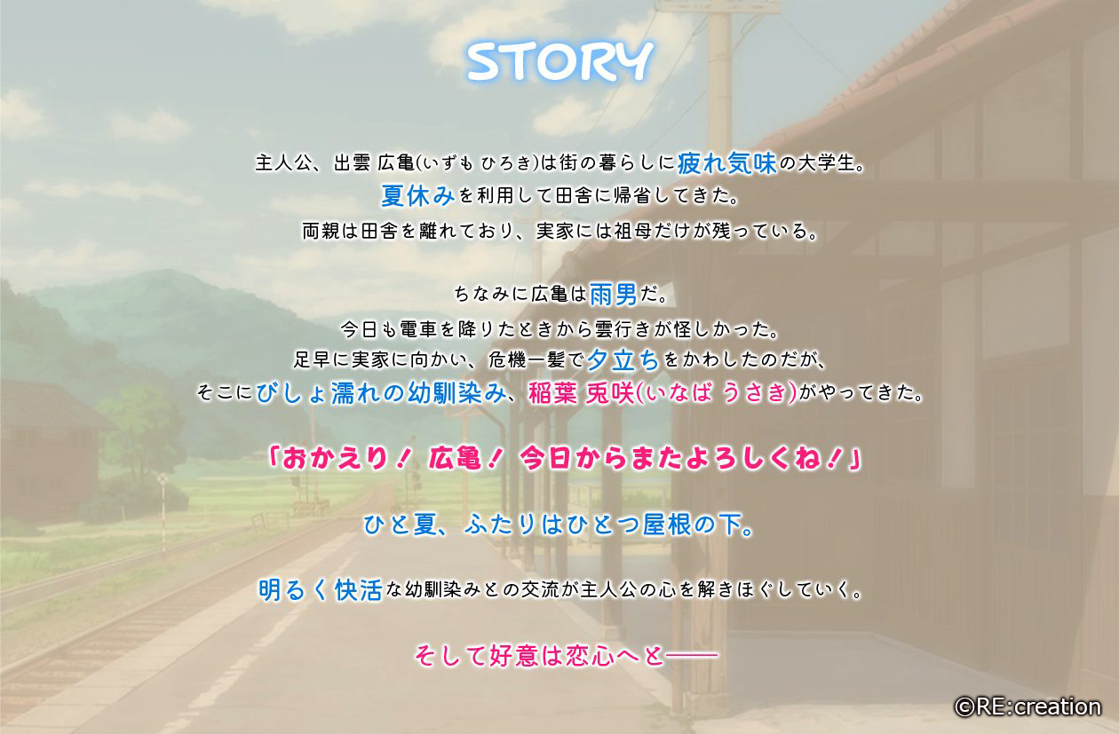ヒロインである幼馴染み、稲葉兎咲(いなばうさき)は主人公の出雲広亀(いずもひろき)と昔からよく遊んでいた幼馴染み。主人公はもともと快活で面倒見のいい性格だったが、一年前、都会の大学へ進学てからは都会暮らしに疲れて自信喪失気味。そんな彼だが、兎咲のポジティブさに接していくことで本来の明るさを取り戻してゆく…。