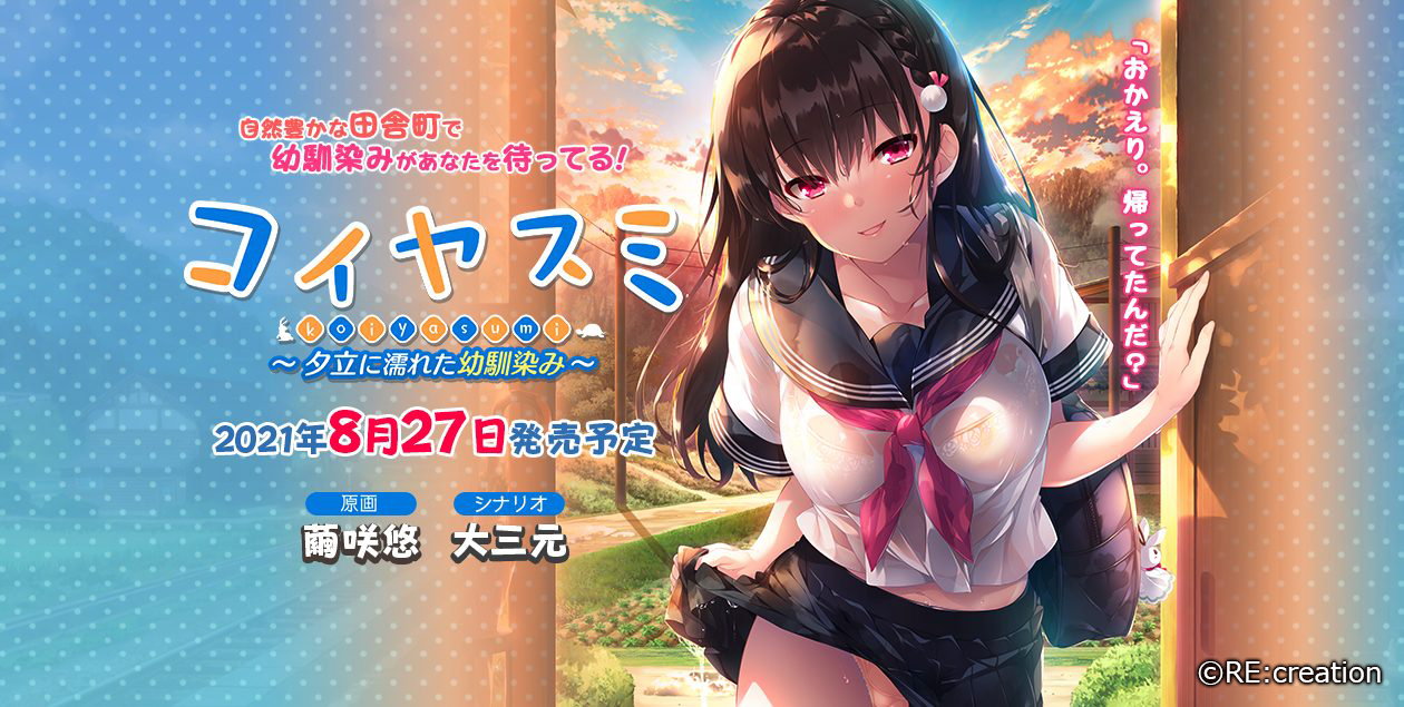 新ブランド・RE:creationからリリースされる『コイヤスミ 〜夕立に濡れた幼馴染み〜』は、幼馴染みと過ごす休みをテーマにした連作の一作目にあたる。本作は夏休み編として、主人公が大学の夏休みを利用して都会から実家のある田舎に戻ってきたところから始まる物語。幼馴染みと二人きりで過ごす夏は、きっと特別なものになるぞ♥
