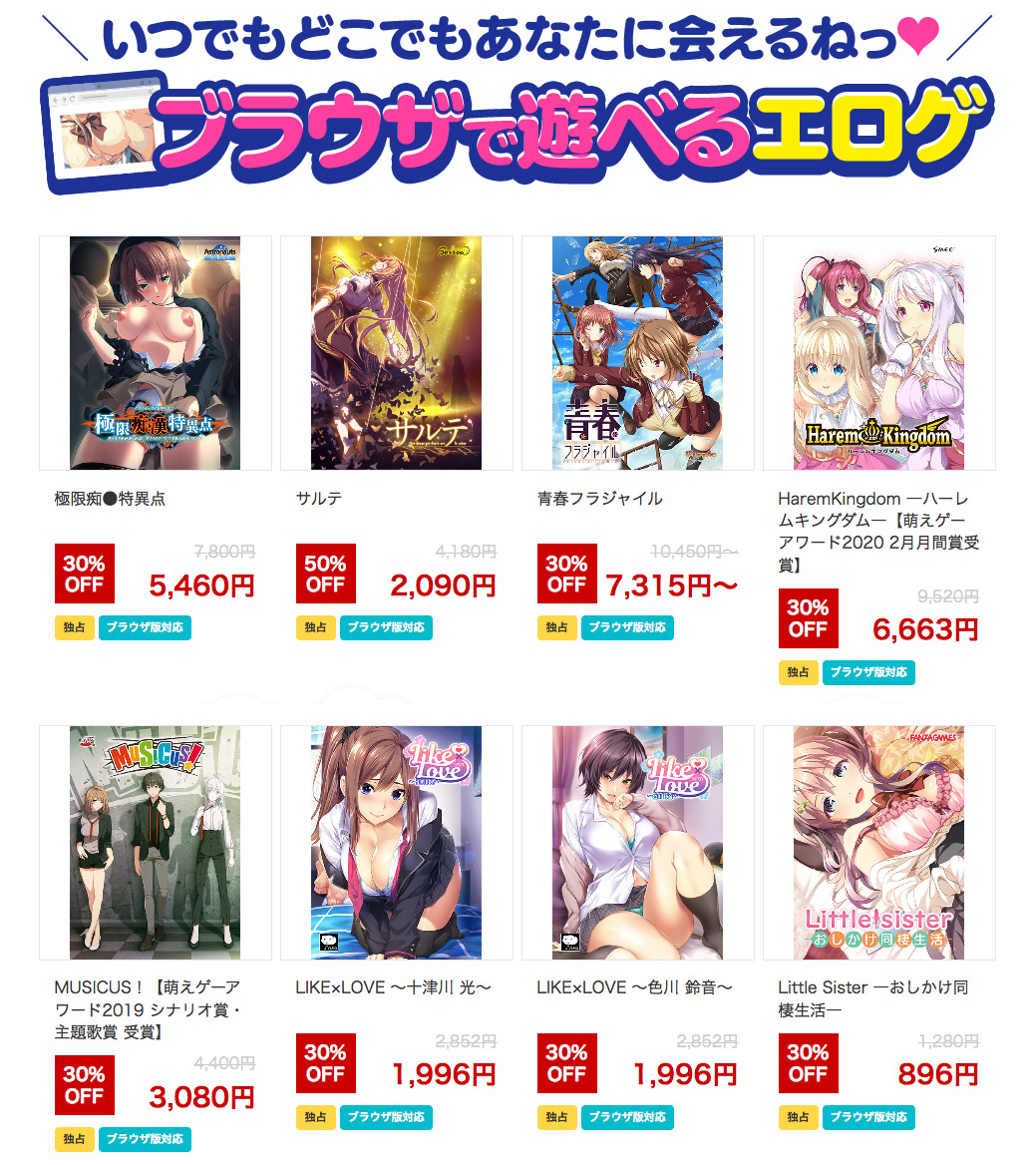 iPhoneなどのスマホやタブレットでもプレイ可能な、ブラウザ対応の美少女ゲームも20タイトルがセールの対象になっている。『放課後シンデレラ』(HOOKSOFT)、『青春フラジャイル』(パープルソフトウェア)、『極限痴漢特異点』(アストロノーツ)等、30%OFFだが発売間もない新作が多いのが特徴。スマホで手軽に流行の話題作が遊べるちゃうので、自宅にPCが無い人も是非チェックしてみよう。