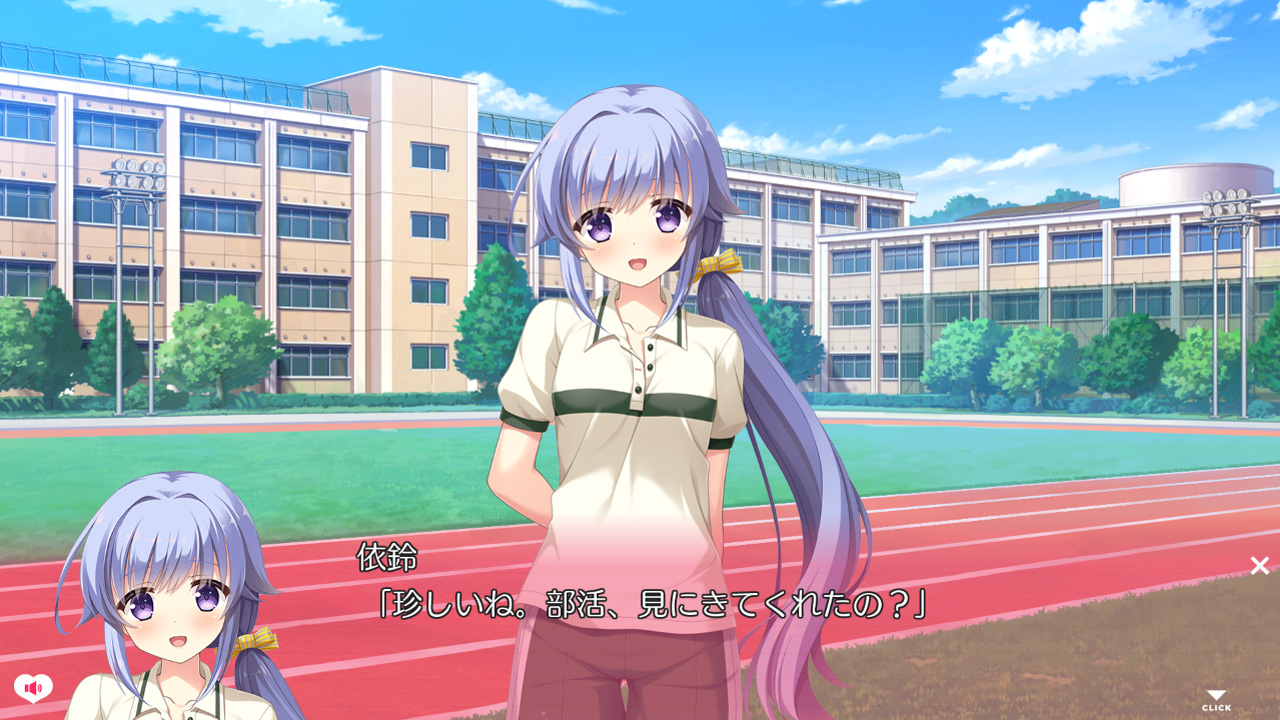 ▲頑張りやの幼なじみ・依鈴(いすず)。陸上部に所属しているスポーツ少女で、ケガで引退した主人公を気にかけている