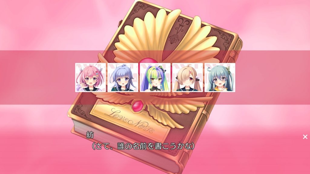 体験版では2回、ノートに誰の名前を書くか選ぶ場面があります。ここで選んだ相手のイベントが発生するのですが、隠された秘密が発覚したりイベントCGを見ることができるのでセーブ&ロードで全ての選択を試してみるのがオススメです。今回のレビューでは個人的に気に入っている琳果を選択した場合のストーリー展開を紹介していますが、他ヒロインorサブキャラを選択した場合も面白いエピソードを見ることができますよ!!