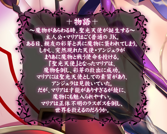 主人公・まりあはごく普通の JK。ある日、親友の彩芽と共に魔物に襲われてしまう。しかし、突然現れた天使の使い・アンジェラがまりあに魔物と戦う使命を授ける。『聖光天使マリア』となったまりあは、魔物を倒し、彩芽の救出に成功。まりあには聖光天使としての素質があり、アンジェラは見抜いていた。だが、まりあは才能がありすぎるが故に、魔物にも魅入られやすい。まりあは正体不明のラスボスを倒し、世界を救えるのだろうか!?
