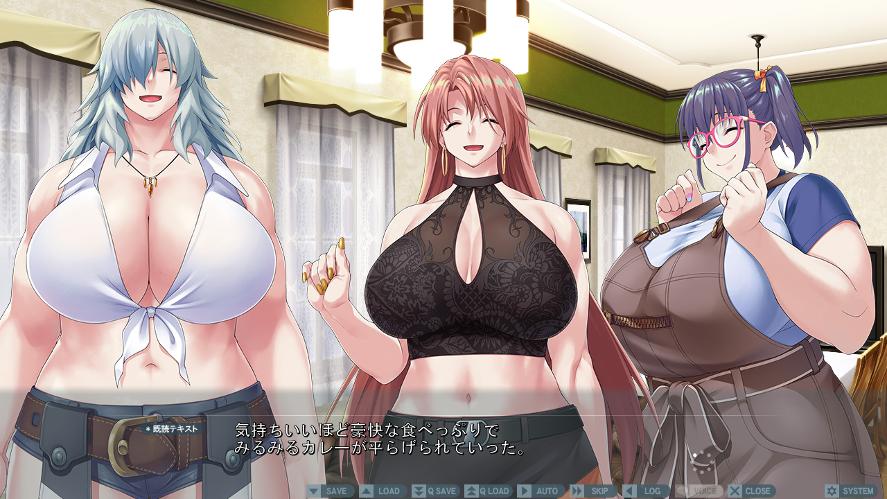 三姉妹が色々な意味で大きいのが目を引く本作。その大きさを強調するような演出も多く、例えば通常の立ち絵会話シーンで頭が画面外に出てしまっていたり、おっぱいやアソコのアップが画面いっぱいに表示されるなどCGに迫力があります。また巨女ヒロインといってもスタイルの良いグラマー系、余ったお肉がたまらないぽっちゃり系、ガッシリと力強いマッチョ系という違いがあり、こだわりを感じさせてくれるのが素晴らしいです!!