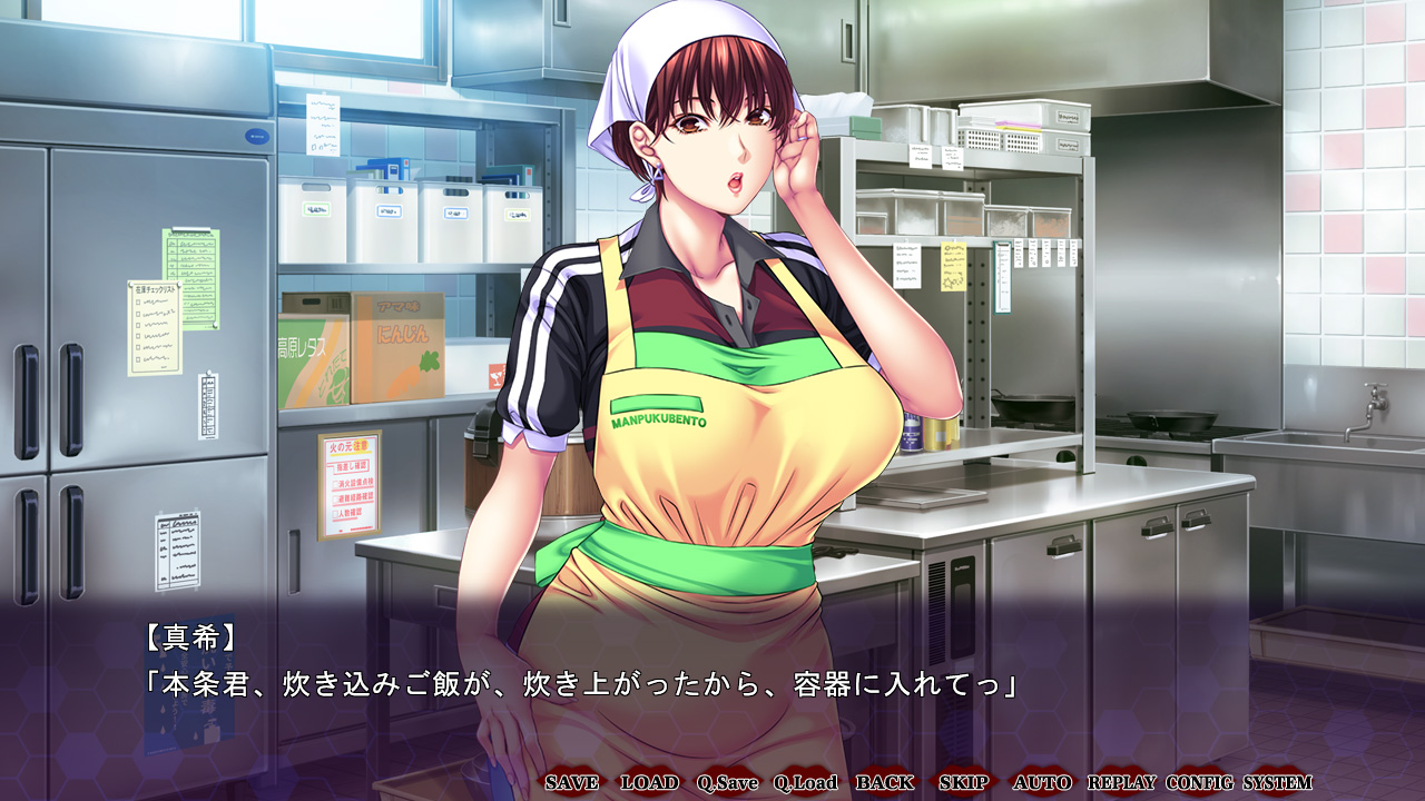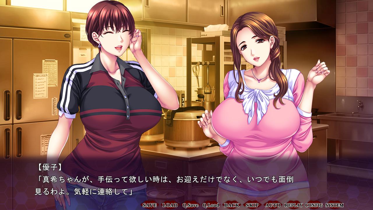 まずは体験版1から。大学生の主人公はアパートで一人暮らしをしつつ、弁当屋でバイトをする忙しくも楽しい日々を送っています。そんな彼を支えるのは優しい大家さん・優子、気さくなバイト仲間・真希、妖艶な喫茶店オーナー・永里香の3人。それぞれ異なる魅力を放つ人妻たちと接するうちに、その豊満な肉体に惹かれていって…といったストーリーになっています。体験版1クリア後にはタイトル画面から真希の手コキと、優子のフェラを見ることができますよ!!