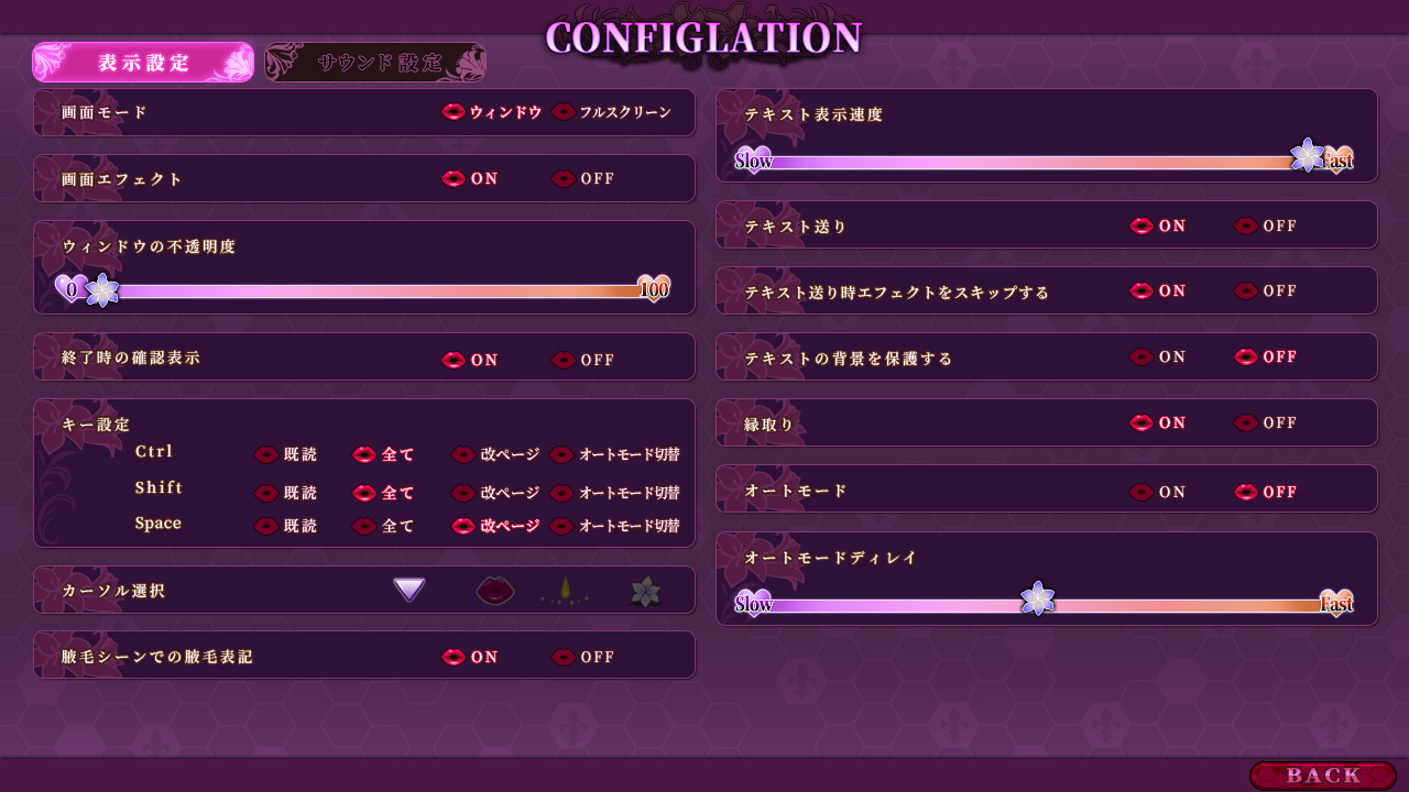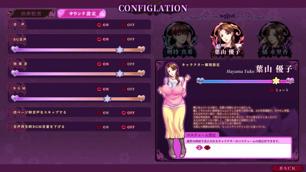 ▲立ち絵の変更はコンフィグの「サウンド設定」にあるので見落とさないようにしよう