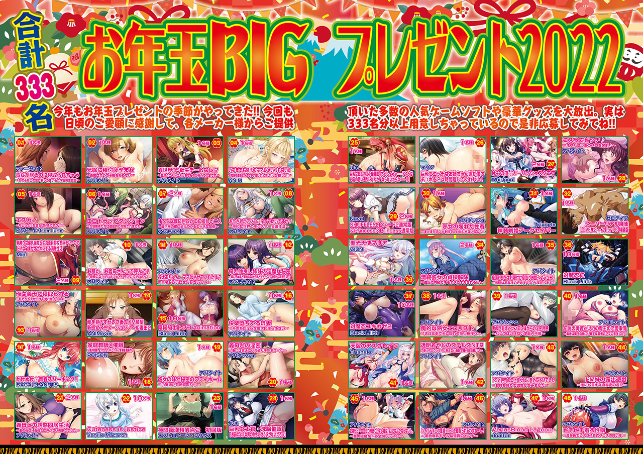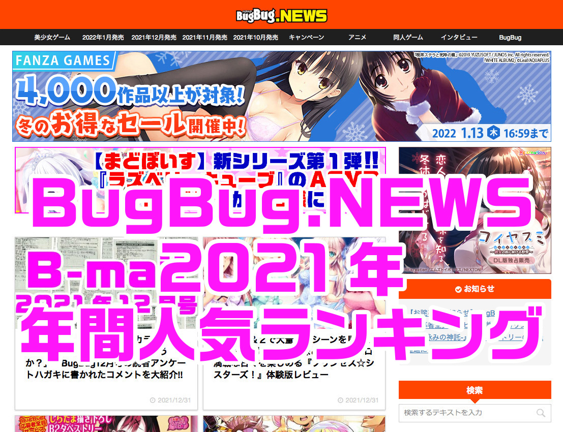 2022年最初の週間ランキングは、様々なプレゼント企画やお得なキャンペーンが注目を集めるというお正月らしい傾向に。そんな中でも強いのはやっぱりエロさに特化した作品の数々♥ ジャンルも有名ブランドの作品からアニメ、フィギュア、同人ソフトとバリエーション豊かにたっぷりヌけるゲームが高いPV数となっていたぞ。2022年もHな情報やお得なキャンペーン情報を積極的に紹介していくBugBug.NEWSをよろしく!!