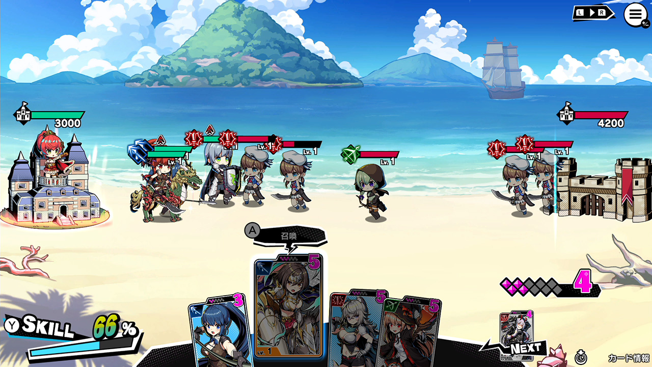バトルでは、時間経過と共に溜まる「マナ」と呼ばれるコストを消費して自軍の城からユニットを召喚することができる。ユニットにはそれぞれ近距離、中距離、遠距離の3種のタイプが設定されており、三すくみの関係となっているので敵のタイプに合わせてユニットを選ぶことが攻略の鍵となってくるぞ。また、手札に同一ユニットが存在する場合、二つを合成して強化する「オーバーライド」が発動可能に!!