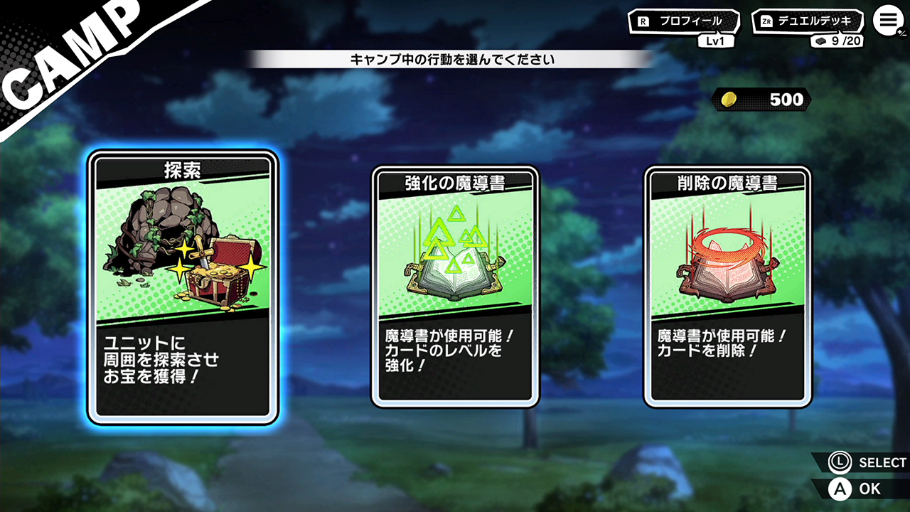 ▲「キャンプ」では報酬を得られる探索や、ユニットの強化を行うことができるのだ