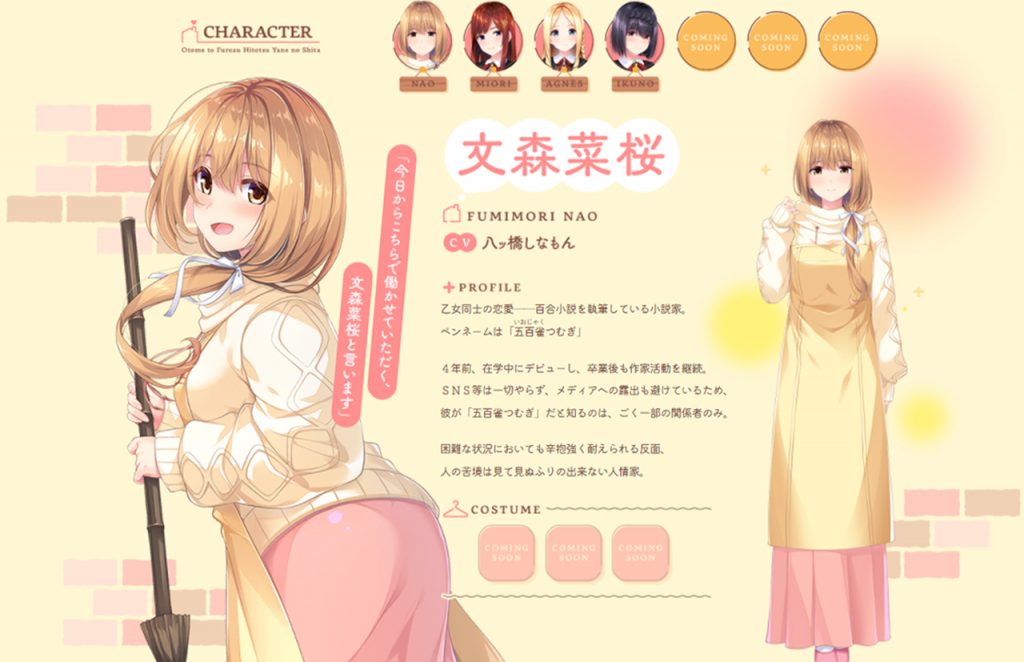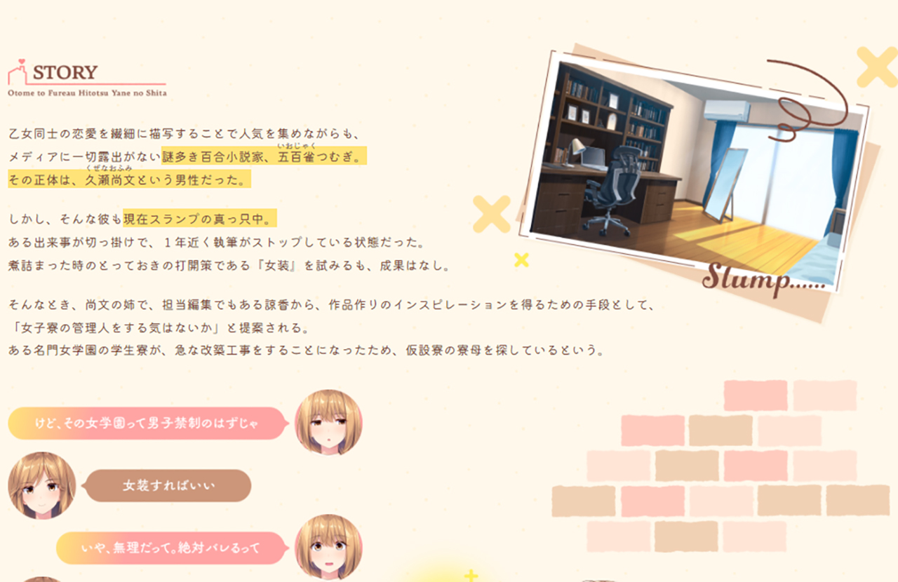 ▲”五百雀つむぎ”というペンネームの百合小説家として活動中の主人公の本名は久瀬尚文。スランプで1年近く執筆がストップしているらしい