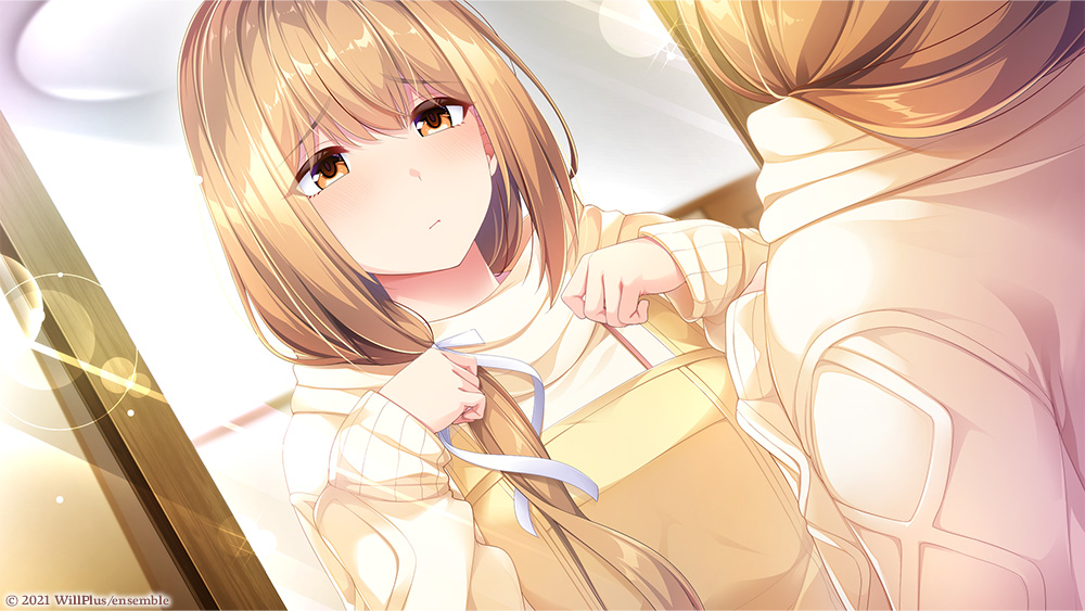 ▲鏡の前で自分の女装ぶりを確認する主人公。本人は不満気味だけど、第三者的には違和感なさ過ぎだよ