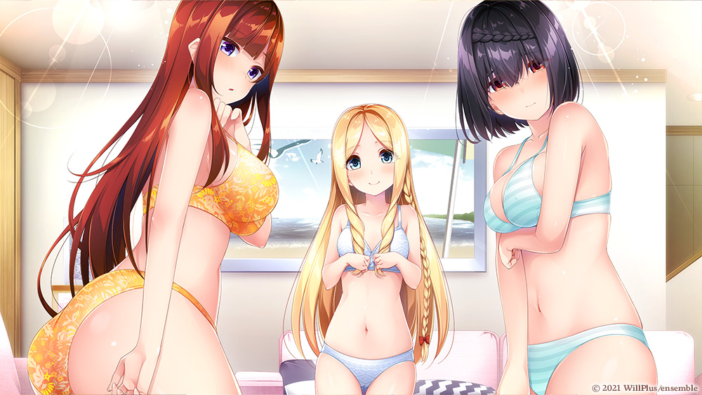 ▲下着姿で現れた寮生の3人。ドギマギし過ぎて女装がバレないように注意しないと!!