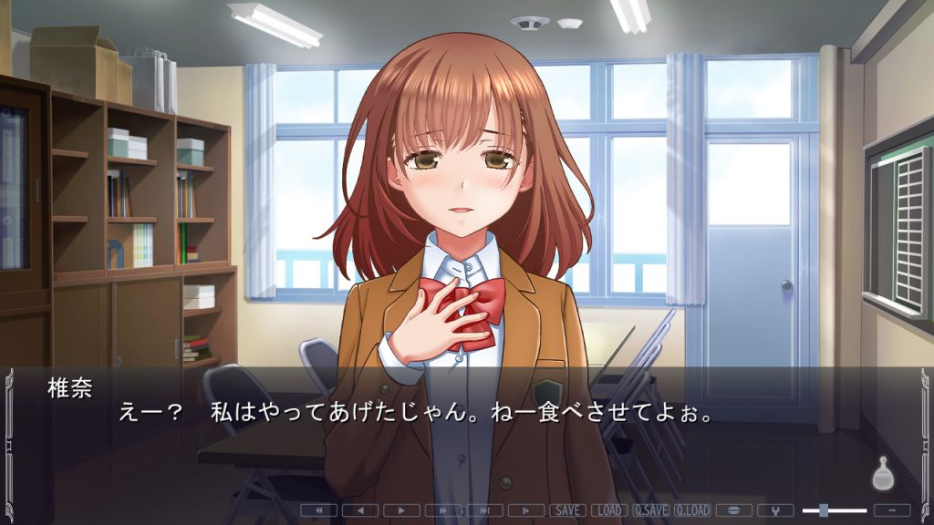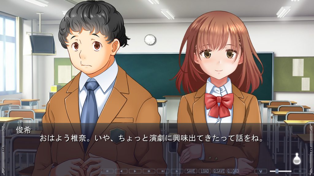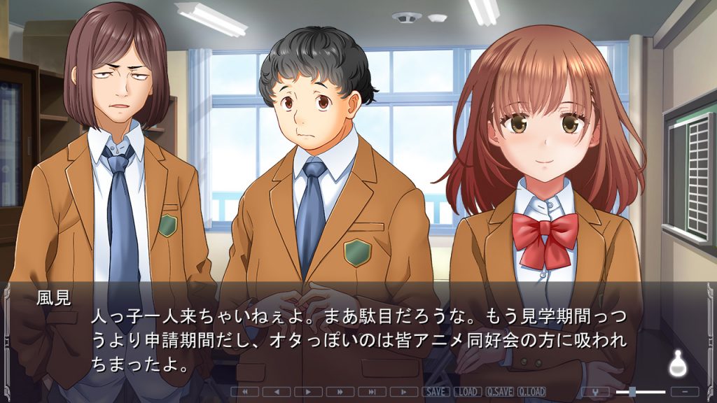 ▲文芸部のオタク友達と会話中の主人公とヒロイン・椎奈。新入部員が来ないらしいが…