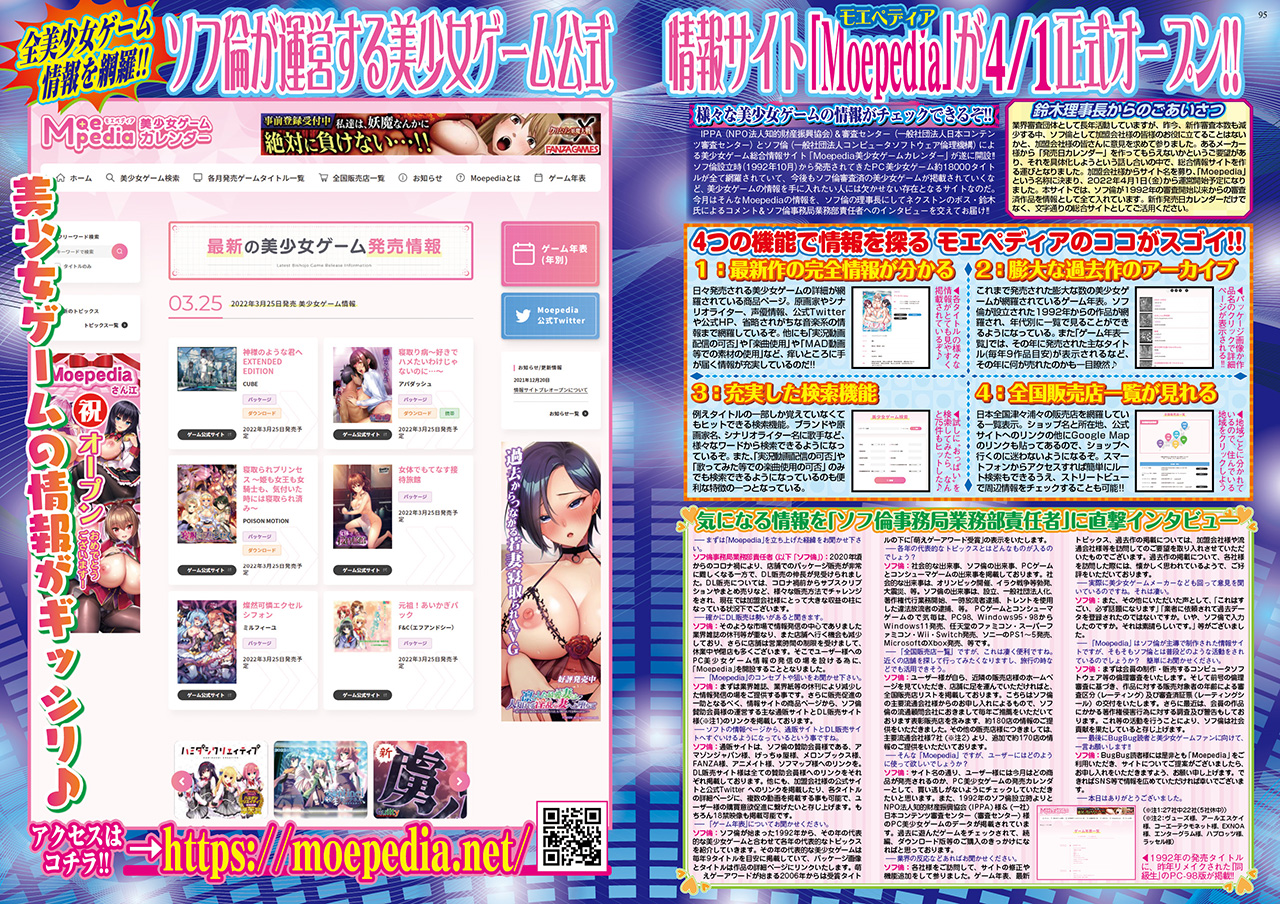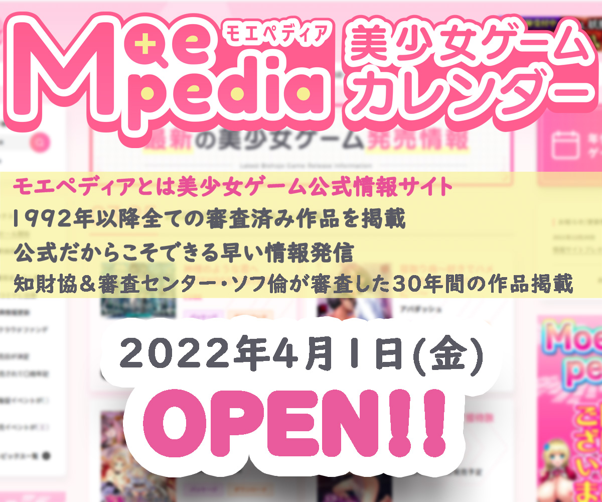 業界審査団体として長年活動していますが、昨今、新作審査本数も減少する中、ソフ倫として加盟会社様の皆様のお役に立てることはないかと、加盟会社様の皆さんに意見を求めて参りました。あるメーカー様から「発売日カレンダー」を作ってもらえないかというご要望があり、それを具体化しようという話し合いの中で、総合情報サイトを作る運びとなりました。加盟会社様からサイト名を募り、「Moepedia」という名称に決まり、2022年4月1日(金)から運営開始予定になりました。本サイトでは、ソフ倫が1992年の審査開始以来からの審査済作品を情報として全て入れています。新作発売日カレンダーだけでなく、文字通りの総合サイトとしてご活用ください。