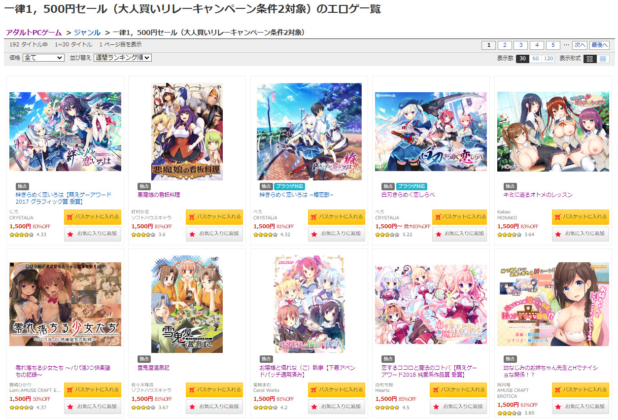 対象192作品が税込1,500円ポッキリで購入できるセール。元値にかかわらず一律1,500円になるため意外と割引率は高い。50%~80%以上の割引は当たり前という、隠れた激安キャンペーンなのだ!!