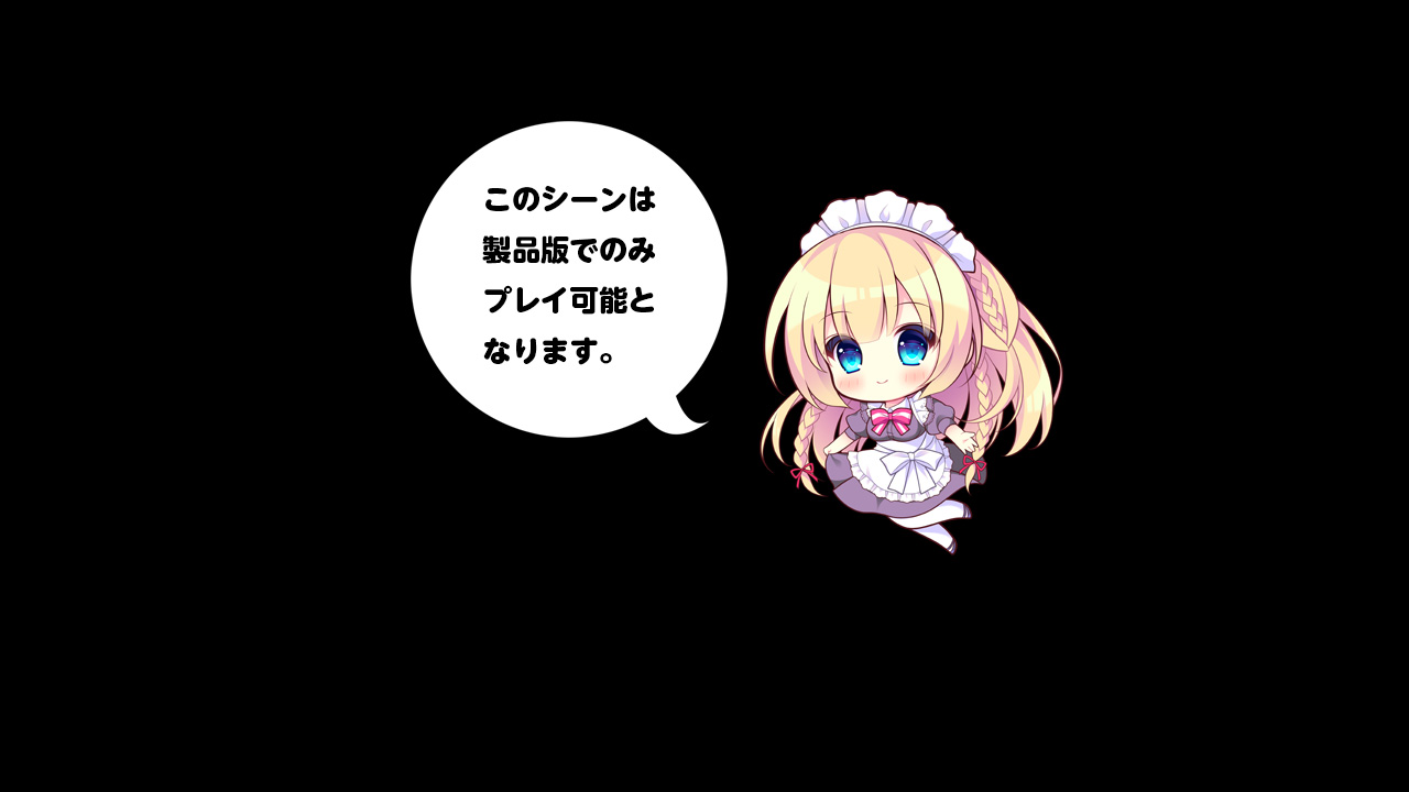 元々が両想いで許嫁、しかも一緒に暮らしているのだから早い段階でHシーンを見ることができます。ただし体験版なので過度な期待は禁物です。理由は下の画像をご覧いただければわかるかと…。まぁ序盤からHシーンがあるってことは数自体は多いと思われますので、お楽しみは製品版の発売まで取っておきましょう。公式HPのキャラ紹介を見ると、メイド服と制服の他に和服ウェイトレスや体操服の立ち絵差分があるので、そちらの衣装Hも期待ですよ!!