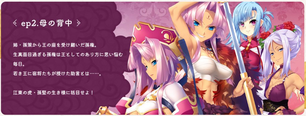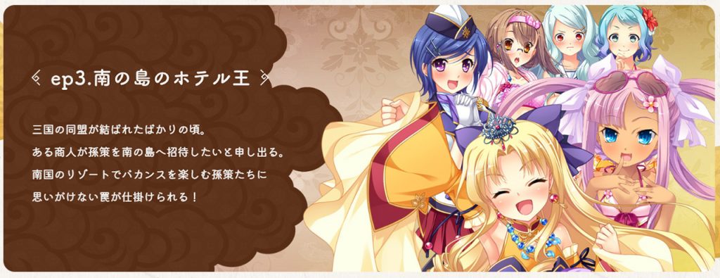 ▲収録エピソードは、大陸一周の旅に出た孫策たちの物語「ep.1 断金の旅路」、思い悩む孫権に呉の宿将達が過去の想い出話を披露する「ep.2 母の背中」、南の島に招かれた孫尚香たちがホテル王の罠にかかってしまう「ep.3 南の島のホテル王」の3つ