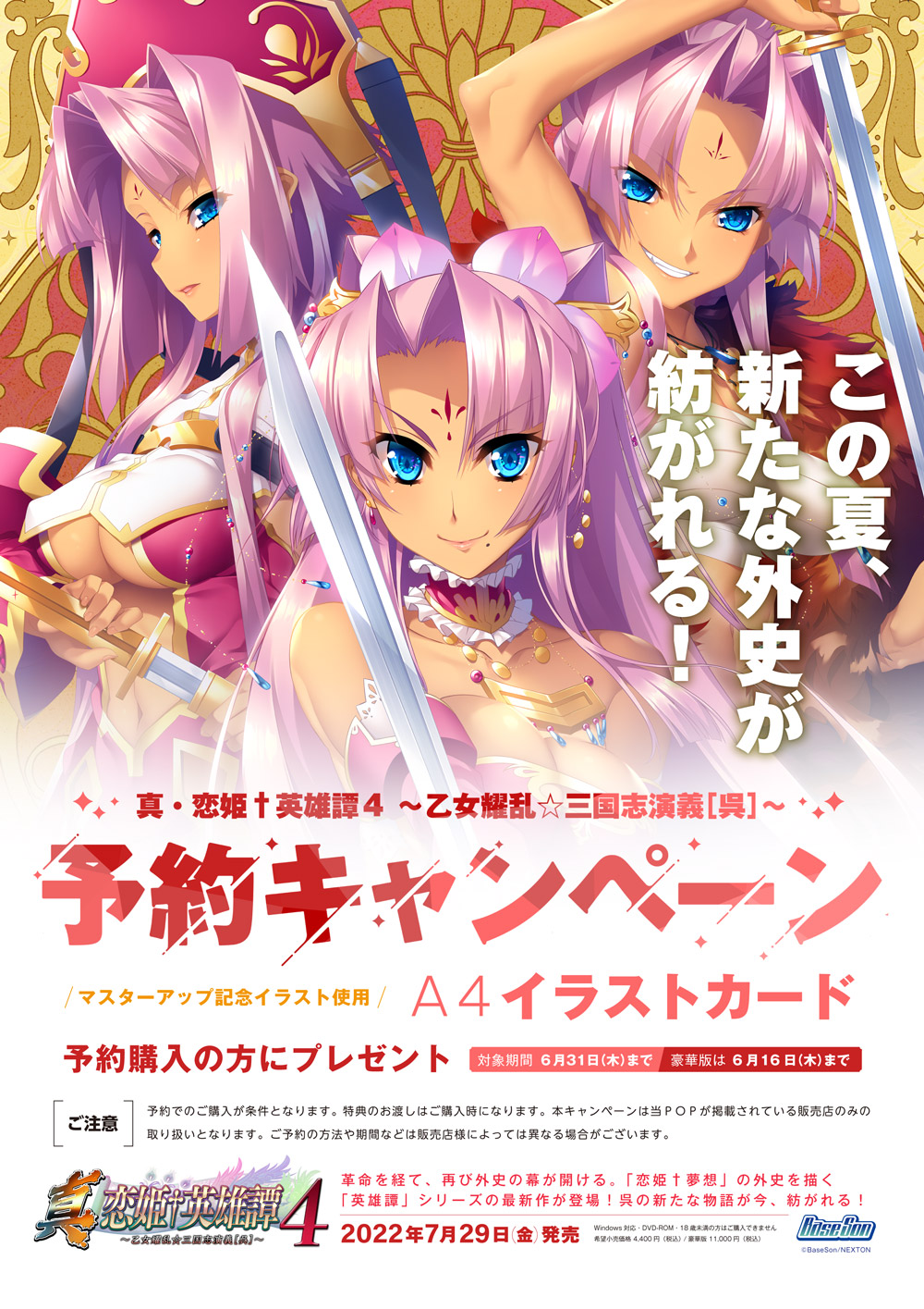 2015年にDL販売作品として登場した「真・恋姫†英雄譚」。和平の象徴になった主人公・一刀が定期的に魏・呉・蜀の三国を巡回しつつ、問題解決したり、各国の君主とイチャイチャしたりする物語が楽しめる作品だ。そのシリーズの続編『真・恋姫†英雄譚4 ~乙女耀乱☆三国志演義[呉]~』が満を持して登場。サブタイトルからも分かるとおり、新作の舞台は孫策が治める呉で、孫三姉妹が活躍する3つのエピソードが楽しめるのだ。そんな本作の見どころを、公式サイトの情報を中心に紹介していくぞ。