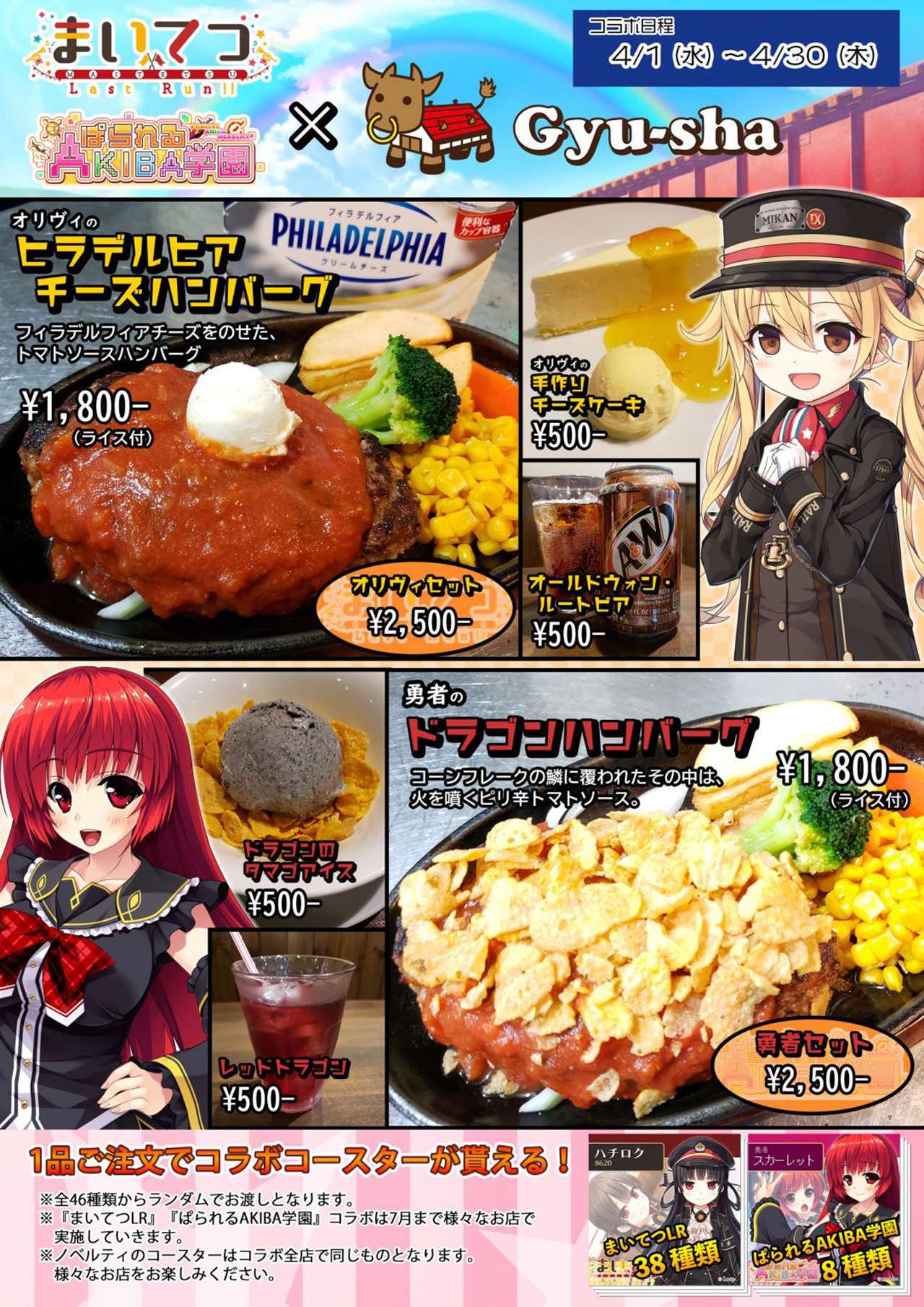 メニュー1品を注文でコラボコースターが1枚貰えるぞ。セットメニューだと5枚貰えてお得なのだ。コースターは2作品のヒロインが描かれた全46種類あってランダムで貰えるが、今回は特別に『まいてつ Last Run!!』のヒロイン5枚をお借りして撮影。ちなみに合同飲食店コラボは7月まで様々なお店で実施される予定だ。