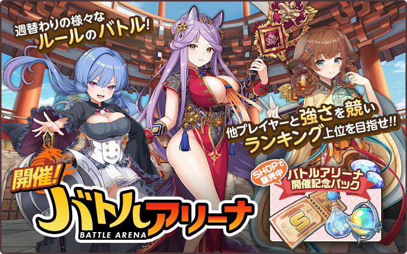 ▲バトルアリーナ開催を記念して3大キャンペーンを実施中!! 【1. 獲得経験値アップ!】開催を記念したキャンペーンで、メインクエスト・素材クエスト・EXバトルでの獲得経験値が大幅アップできるぞ♪ 【2.バトルアリーナ開催記念ログインボーナス】期間中毎日ログインでPremiumガチャチケットが10枚、無償ダイヤが500個も貰えるサービスを実施中!! 【3.バトルアリーナ開催記念パック】開催を記念した、お得なお役立ちパックを期間限定で販売中。「バトルアリーナ開催記念パック ダイヤ:980個」「S確定ガチャチケット:1枚(おまけ) 」「100,000ゴールド(おまけ)」等々、超大盤振る舞い!! 購入は1回限定となるので、お得なチャンスをお見逃しなく!!