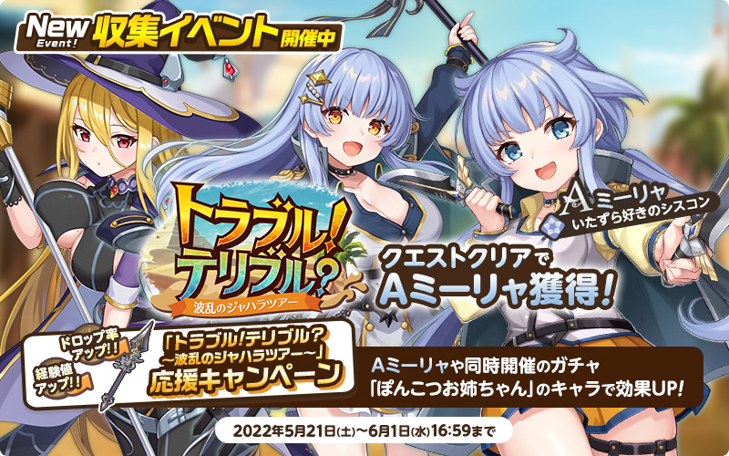 ▲5月21日(土)より収集イベント「トラブル!テリブル?波乱のジャハラツアー」が開催中!! ドロップアイテムとしてイベント交換用アイテム「ラクダ」を獲得でき、イベント限定交換所で様々なアイテムと交換できるのだ。今回追加された新キャラ3人などイベントキャンペーン対象キャラを編成すると、「ラクダ」のドロップ率が上昇するぞ。またイベント開催期間中には限定ミッションが開催され、「トワイライトロッドの精錬石」や「スペードハンドの精錬石」などが獲得可能。他にも新イベント開催を記念し、特別なログインボーナスや追加ログインミッションパックの販売など盛り沢山♪ 期間は6月1日(水)16:59 までだ