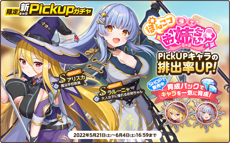 ▲新キャラが追加されたPickUPガチャ「ぽんこつお姉ちゃん」が開催中。「Sアリスカ【魔法学校教員】」、「Sラルーニャ【大人女子に憧れるお姉ちゃん】」、「Aアスィーラ【目指せ!世界一のツアコン】」、以上3名が追加されたのだ。開催期間は5月21日(土) ~ 6月4日(土)16:59まで