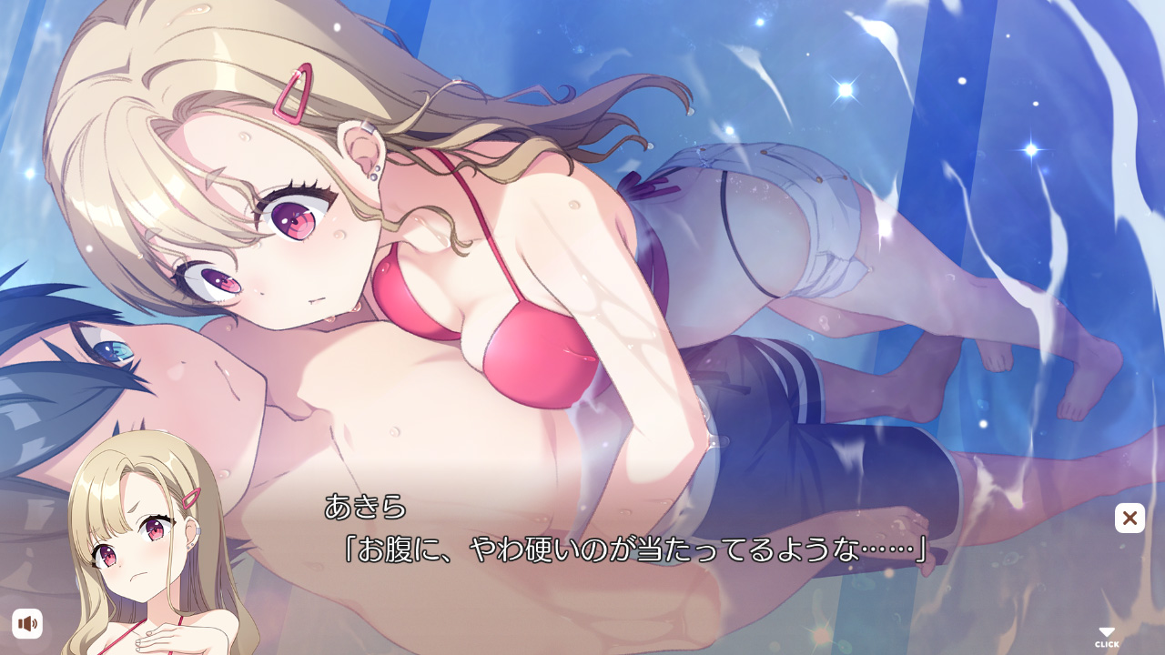 ▲普段と同じく抱き着いてくるあきらだけど、水着なので感触がダイレクトに伝わりヤバい状態に!!