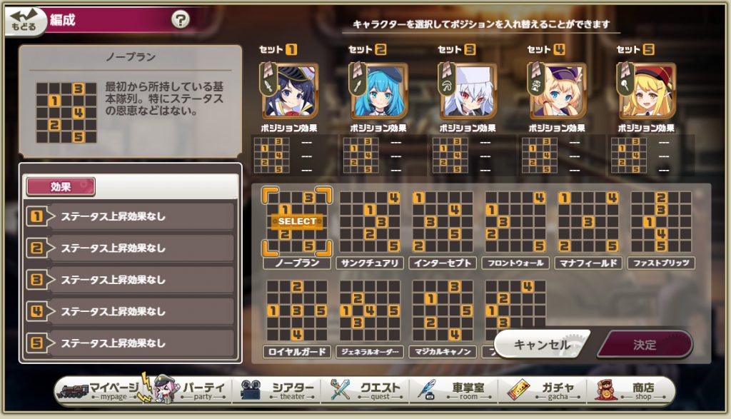 ▲編成画面で選択できる隊列では、種類や配置によってステータス上昇効果を受けられるぞ
