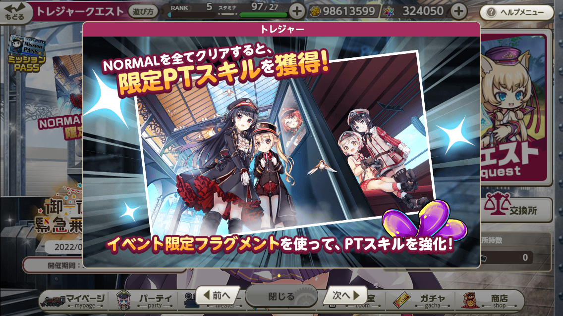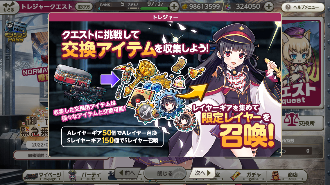 ▲クエストに挑戦していくと限定レイヤーと交換できるぞ。レイヤーはヒロインの衣装に加えて、能力値やスキルなどを上昇させるのだ。パーティ全体に好影響を与えるパーティスキルも、イベント限定のものが獲得できるぞ