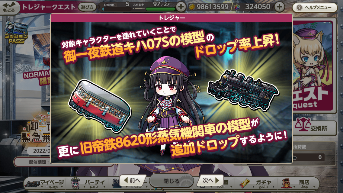 今回のコラボのメインとなるトレジャーイベント【出発進行! 御一夜鉄道からの緊急乗り入れ運転!?】は、前半が6/15(水)メンテ後~6/24(金) 23:59まで、後半が6/20(月)12:00 ~6/24(金)23:59まで開催。報酬で「Sハチロク[ニシキ!?のケモ耳レイルロオド]」と「パーティスキル[異世界の列車で]」が入手できるぞ。コラボ限定Limitedガチャは、「第一弾【出発進行! 御一夜鉄道からの緊急乗り入れ運転!?】が6/15(水)メンテ明け~7/7(木)23:59に開催。他にも「まいてつコラボ記念ログインボーナス」「6月トレジャー応援ログインボーナス」等々、コラボならではのお宝がイッパイ♪ しかもLimitedガチャは「第一弾」となっているので、さらに「第二弾」などの展開も…? 『まいてつ』ファンも『ミストレX』ファンも目指せフルコンプだ!!