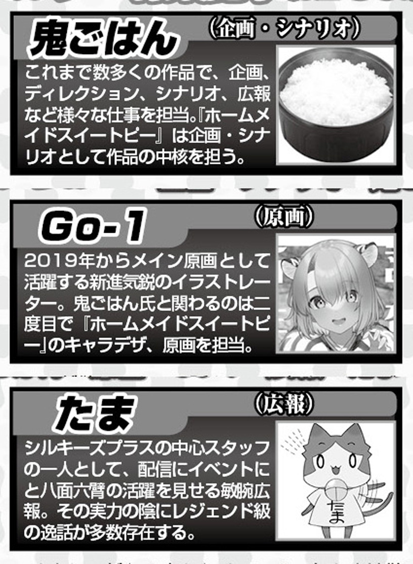▲今回のインタビューに参加していただいた3名のプロフィールを紹介。鬼ごはん氏とGo-1氏はこれまでのお仕事についても囲みで紹介しているぞ