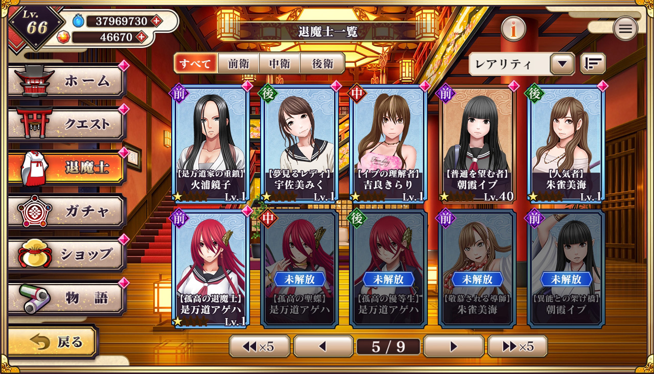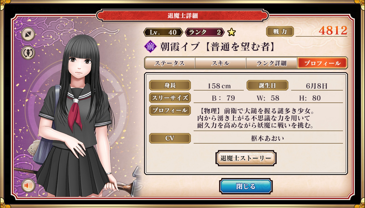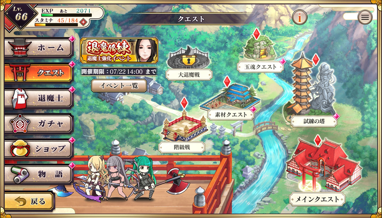 本作は主人公・朝霞イブが数奇な運命に翻弄されながらも、退魔士として成長していく物語をメインクエストで読み進められるようになっている。並行して期間限定クエストも開催されているが、まずはメインを進めるのがオススメ。メインの進行度合いで様々な機能が解放されるからだ。メインクエストは現在7章まで公開されており、もちろん先へ進むごとに敵が強くなっていく。しかし毎日コツコツとプレイし、無料ガチャを回したり、クエストやイベントを周回していれば大丈夫。鍛え上げたキャラクターは妖魔に負けない立派な退魔士に成長しているはずだ!!