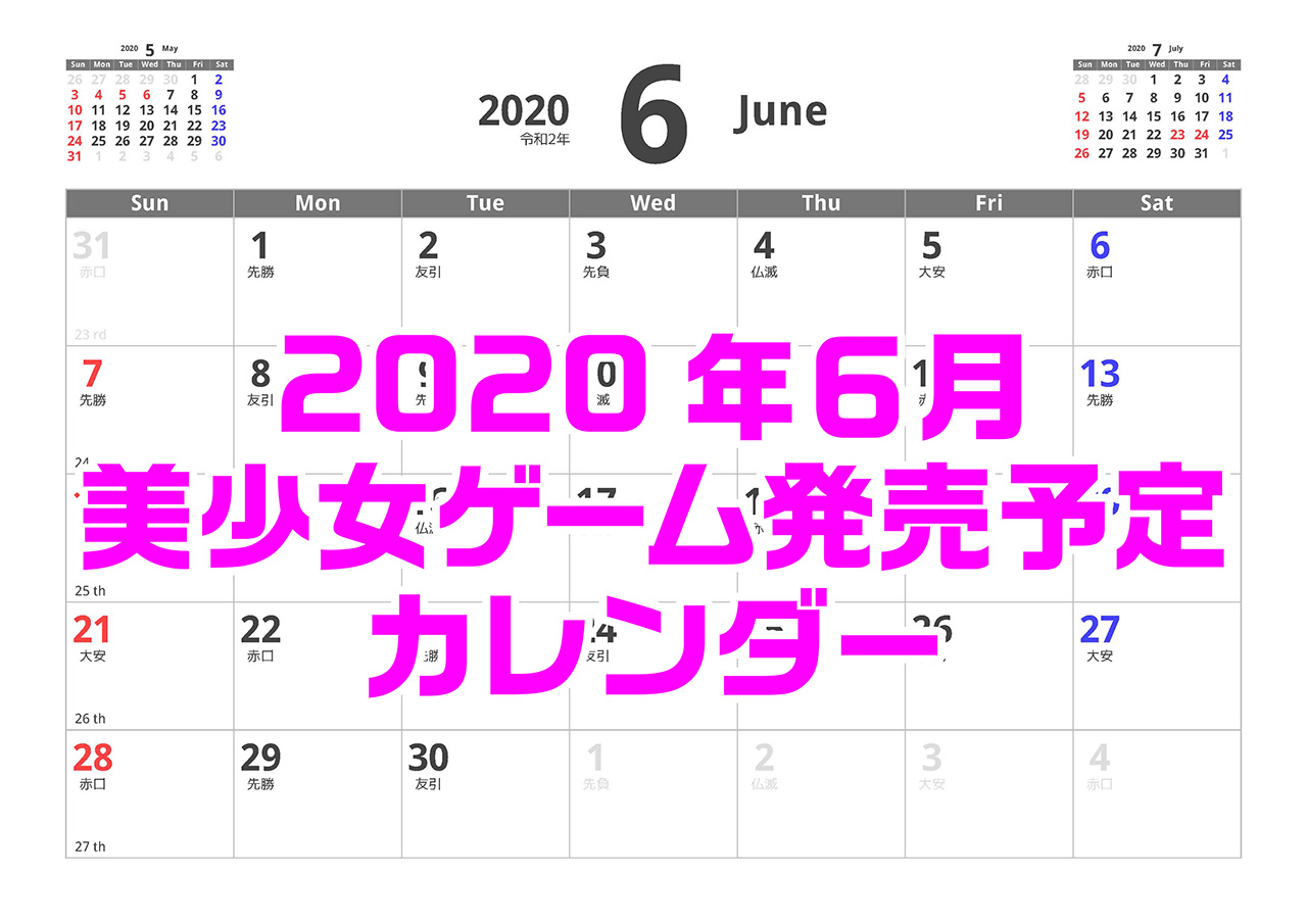 6月26日の「月末エロゲの日」まで後5日。6月1日に公開した2020年6月の発売予定カレンダーの記事から、最新情報を紹介するぞ。今月は意外にも(失礼!!)発売延期作品が少なかった印象。新型コロナウィルスの影響で今月ももっと多いかと危惧していたので、まずは一安心。コロナ禍の影響も一段落…だったら良いのですが。お店に買いに行く時にはマスク着用やソーシャルディスタンスなど感染対策に注意して下さいね!!