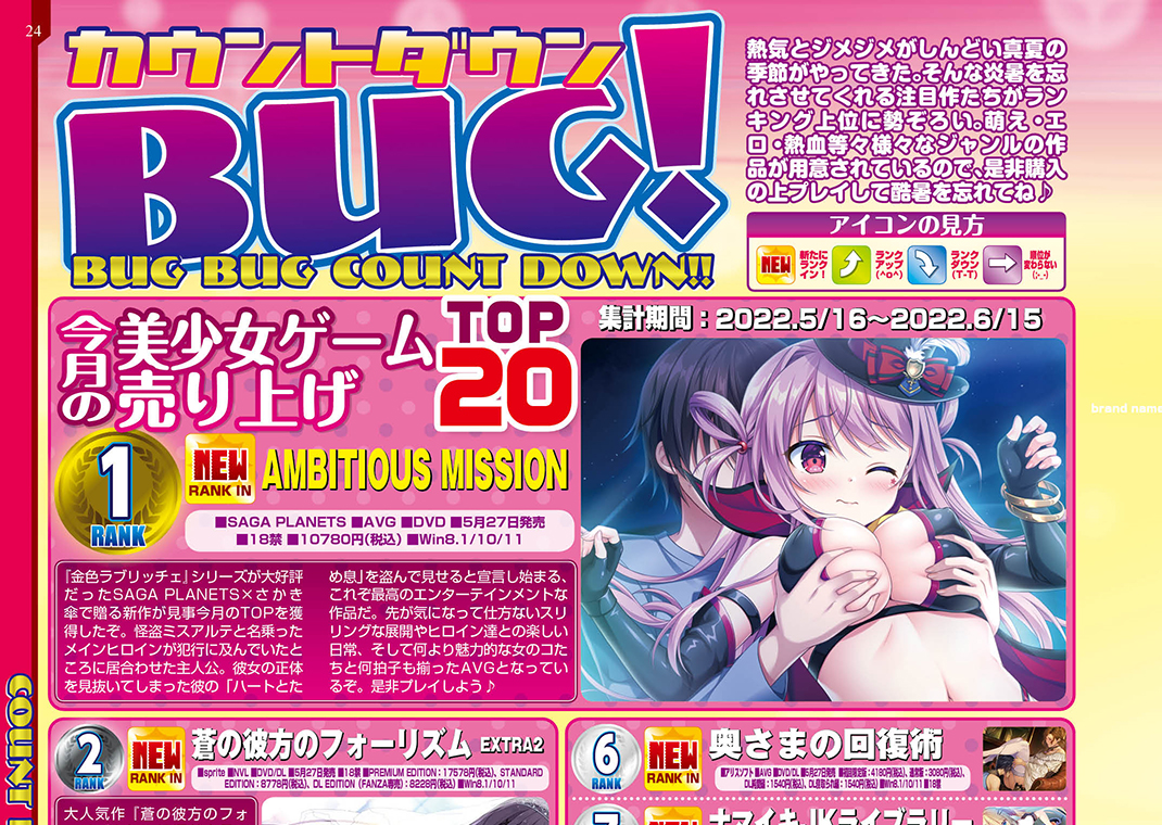 一週間でPV数が多かった記事を振り返る週間ランキングだが、ここ最近は美少女ゲーム系ソーシャルゲームの筆頭とも言える『対魔忍RPGX』では『BLACK LAGOON』コラボ、『エデンズリッターグレンツェ』では1.5周年キャンペーンなど目玉イベントが目白押しということもあって高いPV数となっていたぞ!! BugBug9月号の発売記事もこの記事だけで期待の新作情報が一気にずらりと見られることもあって2位に入り込む大健闘、さらにBugBug本誌はもうすぐ30周年ということで様々なキャンペーンも開催されるのだ。30周年を迎える本誌と共に、BugBug.NEWSで鮮度の高い情報をこれからもチェック!!