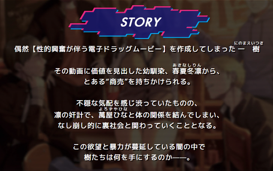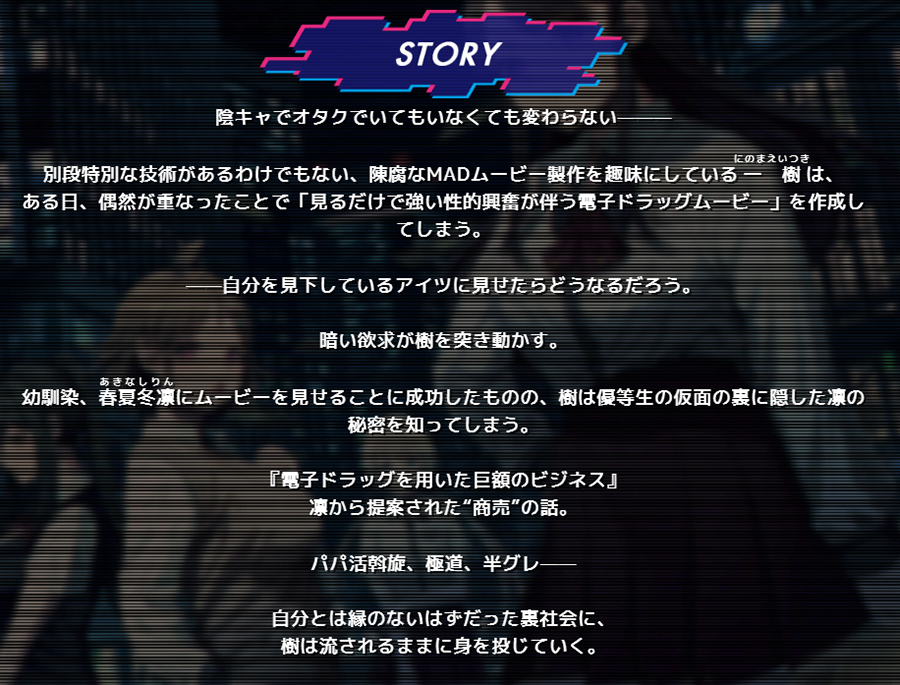 ▲主人公の樹が偶然開発した「見るだけで強い性的興奮が伴う電子ドラッグムービー」が、彼や周りの人たちを裏社会に誘ってしまう