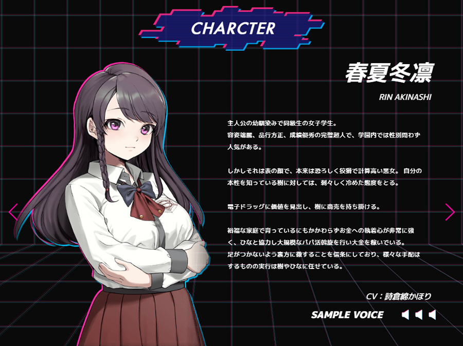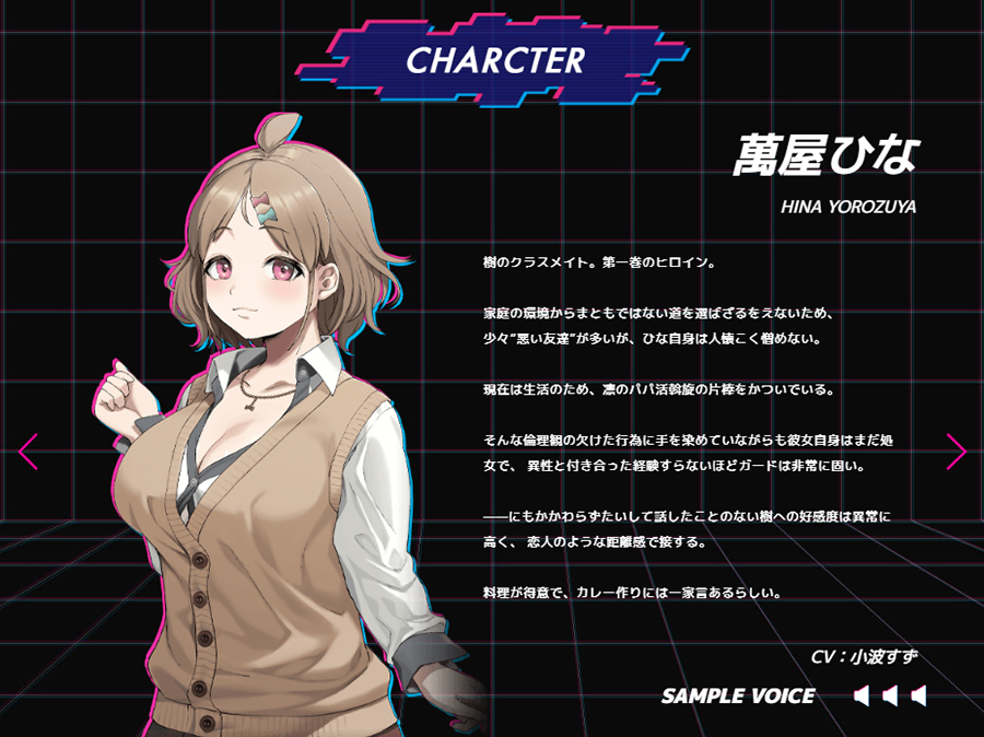 現在、萬屋ひながヒロインの第一話「逸脱者(アウトロー)の矜持」の情報が公開中だ。「強い性的興奮が伴う電子ドラッグムービー」で商売をしたい春夏冬凛の奸計にハマり、ひなと肉体関係を持ってしまった主人公が、なし崩し的に裏社会と関係を持っていく姿が描かれているようだ。体験版も公開されているので、気になる人はぜひチェックしてね!!
