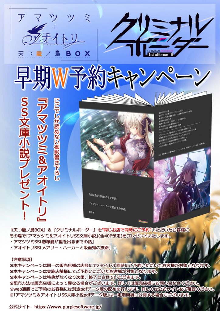 ▲本作と『アマツツミ』と『アオイトリ』の豪華デジパック永久保存セット「天つ籠ノ鳥BOX」を同じお店で予約すると、その場で「アマツツミ&アオイトリ」SS文庫小説が贈呈されるキャンペーンが実施中だ!!