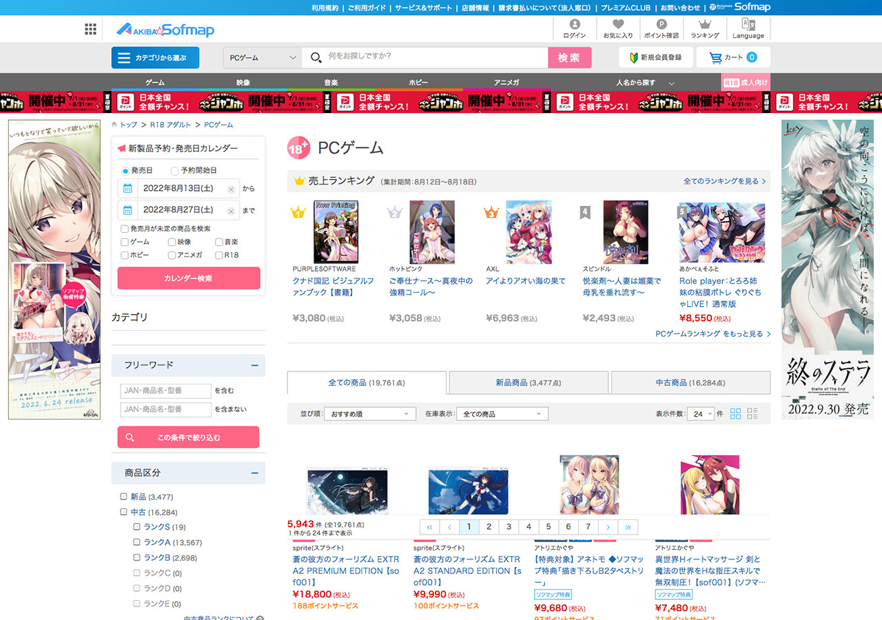 PCゲーム 新品商品・月間・予約商品(集計期間:7月20日~8月18日)