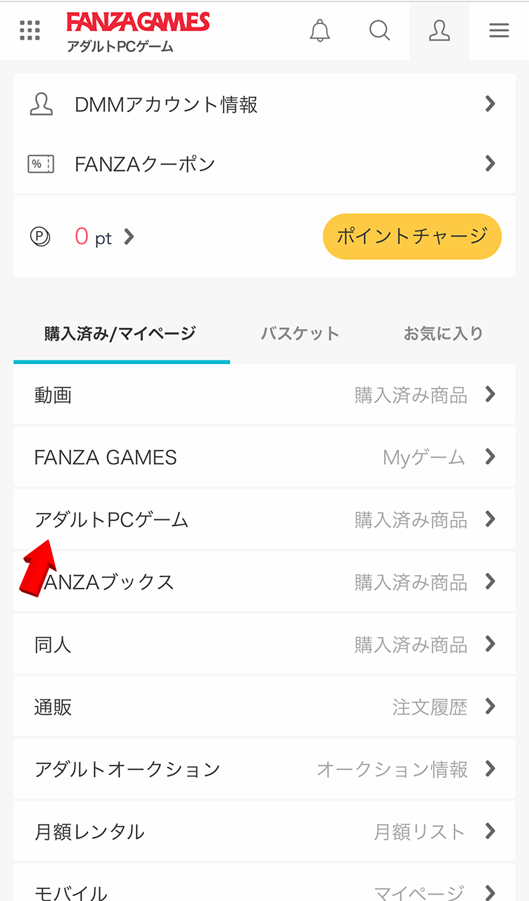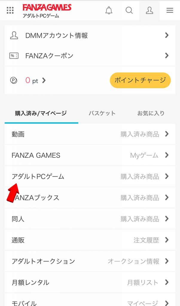 ▲購入手続きが完了したら、DMMアカウント情報内の赤い矢印が指す「アダルトPCゲーム」をタップ。リストに『フタマタ恋愛』が登録されているか確認を
