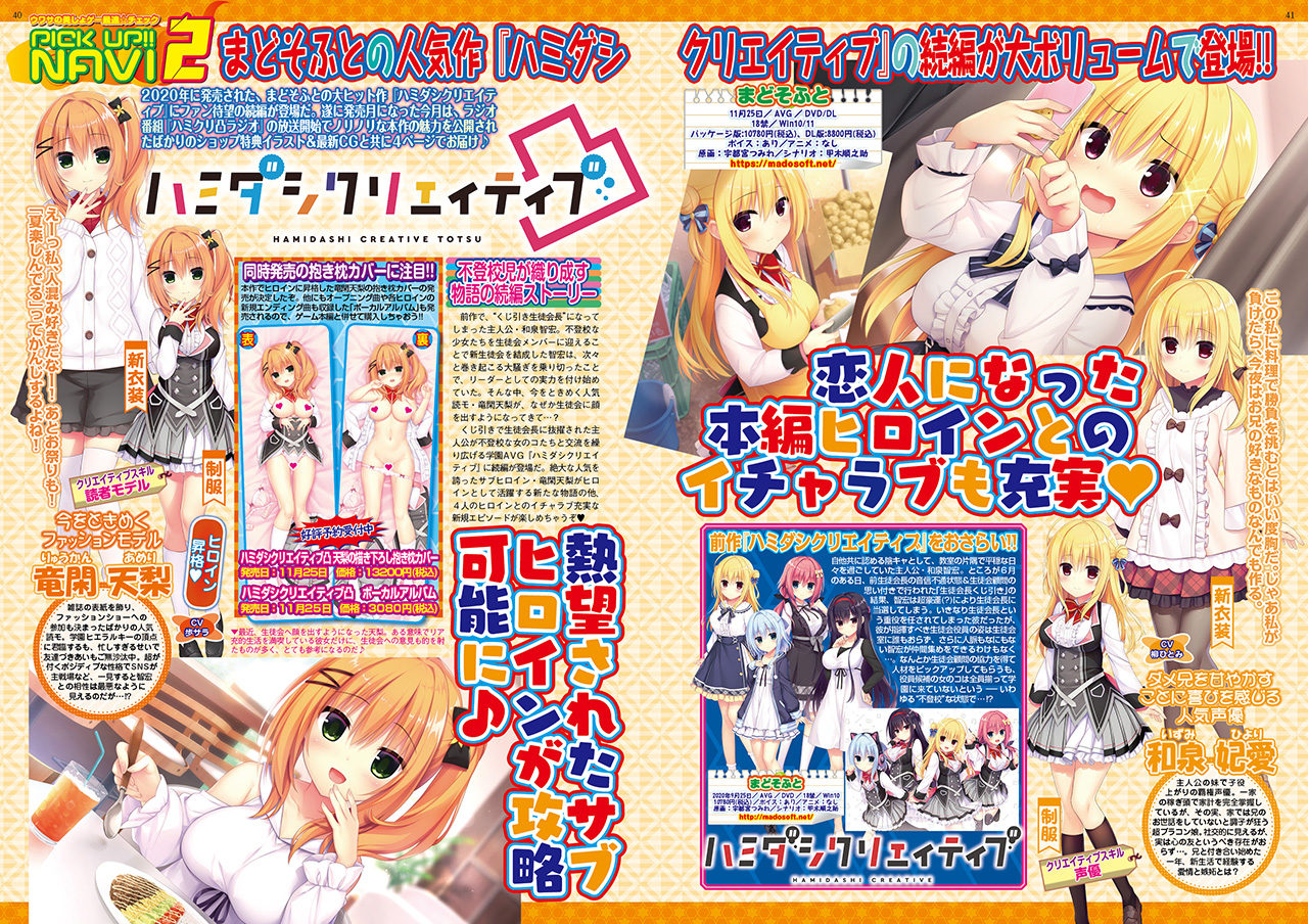 まどそふとの大ヒット作『ハミダシクリエイティブ』にファン待望の続編『ハミダシクリエイティブ凸』が登場!! 絶大な人気を誇ったサブヒロイン・竜閑天梨がヒロインとして活躍する新たな物語の他、4人のヒロインとのイチャラブ充実な新規エピソードが楽しめるのだ。11月を迎えていよいよ発売月になった今月は、ラジオ番組『ハミクリ凸ラジオ』の放送開始など、ノリノリに盛り上がる本作の魅力を大紹介。公開されたばかりのショップ特典イラストや最新イベントCGなど、カラー4ページでお届け♪