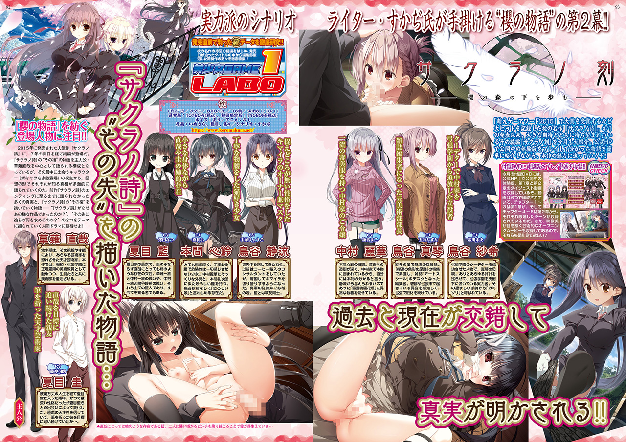 名作『サクラノ詩』の続編として話題沸騰中な枕の『サクラノ刻 -櫻の森の下を歩む-』を、今月も付録DVD連動でカラー6ページにて大特集。誌面では魅力的な登場人物たちを紹介しつつ、新規イベントCGも交えてビジュアル満載で紹介。そして付録DVDでは、公式HP上で公開中の体験版・第1章と第2章から、魅力的なシーンを厳選したダイジェスト動画を収録しているぞ。残念ながら発売は1月に延期してしまったが、誌面と付録DVDの特集記事をジックリ読み込んで、発売を楽しみに待とう。