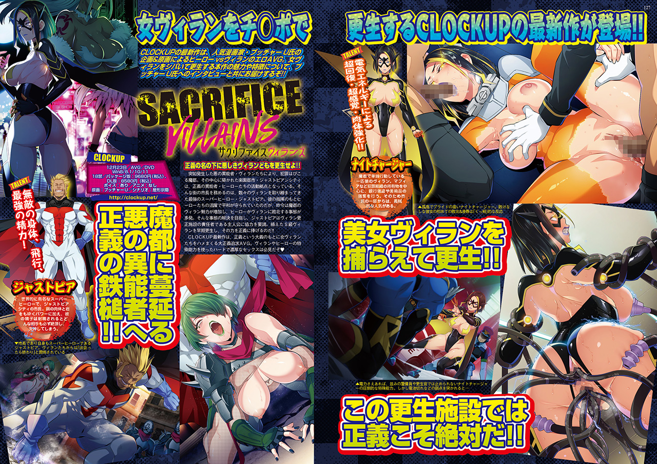 CLOCKUPの最新作は、悪の異能者・ヴィラン女をシバいて更生していく、ヒーローvsヴィランのエロAVG『SACRIFICE VILLAINS』。正義という大義のもとに女ヴィランたちをハメまくっていく、大正義追求ハードエロスに興奮必至なのだ。本作の企画と原画を手掛けるのは、過激エロスで人気の漫画家・ブッチャーU氏。本企画に懸ける想いや魅力について直撃したインタビューを、特集後半2ページに渡って掲載。合わせてカラー6ページで大特集しているぞ。