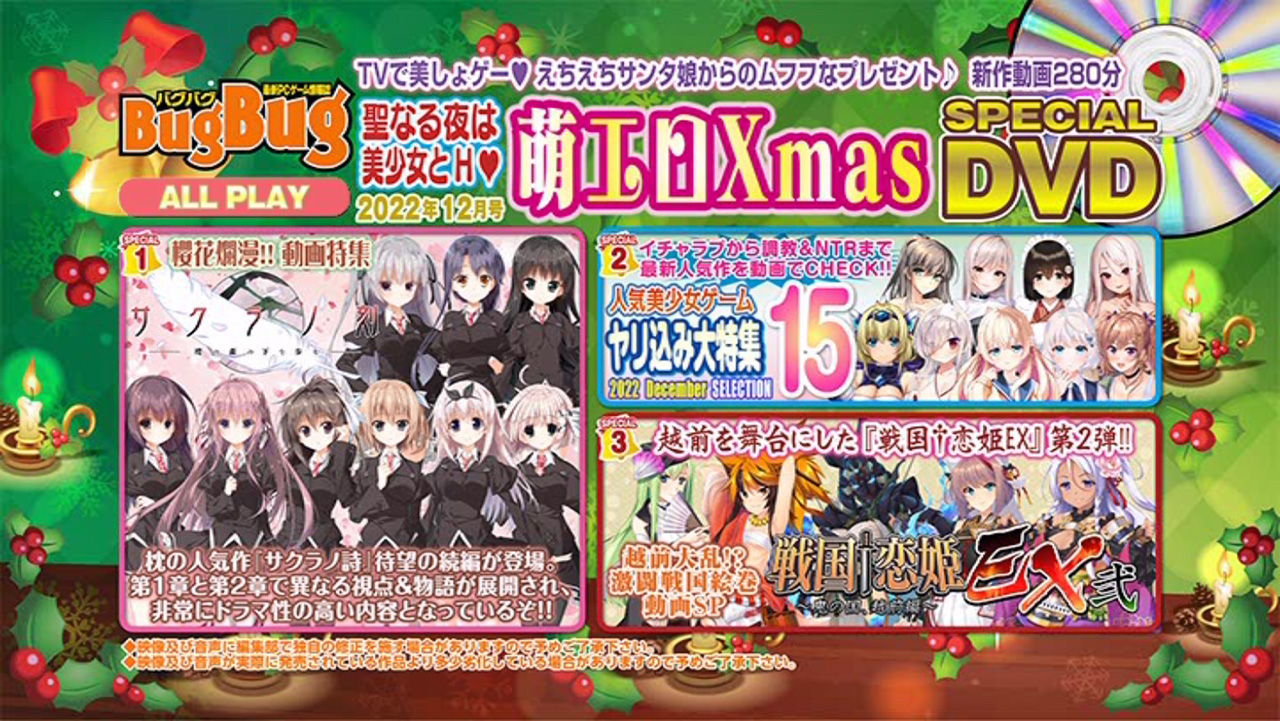 最新の美少女ゲームの魅力をTVでお手軽に楽しめ、大好評なBugBug付録DVD。まず今月は、枕の超話題作『サクラノ刻 -櫻の森の下を歩む-』を、誌面の巻中特集と連動して動画でも大特集。もう一つの特集はBaseSonの『戦国†恋姫EX弐 ~鬼の国、越前編~』お届けしているぞ。そして人気企画「人気美少女ゲームヤリ込み大特集15」では、『放課後シンデレラ2』(HOOKSOFT)、『2045、月より。』(MELLOW)、『Role player:とろろ姉妹の粘膜ポトレ ぐりぐちゃLIVE!』(あかべぇそふとつぅ)等々、話題作15本をHシーン満載で大収録だ♪