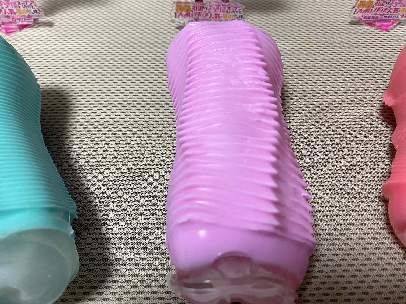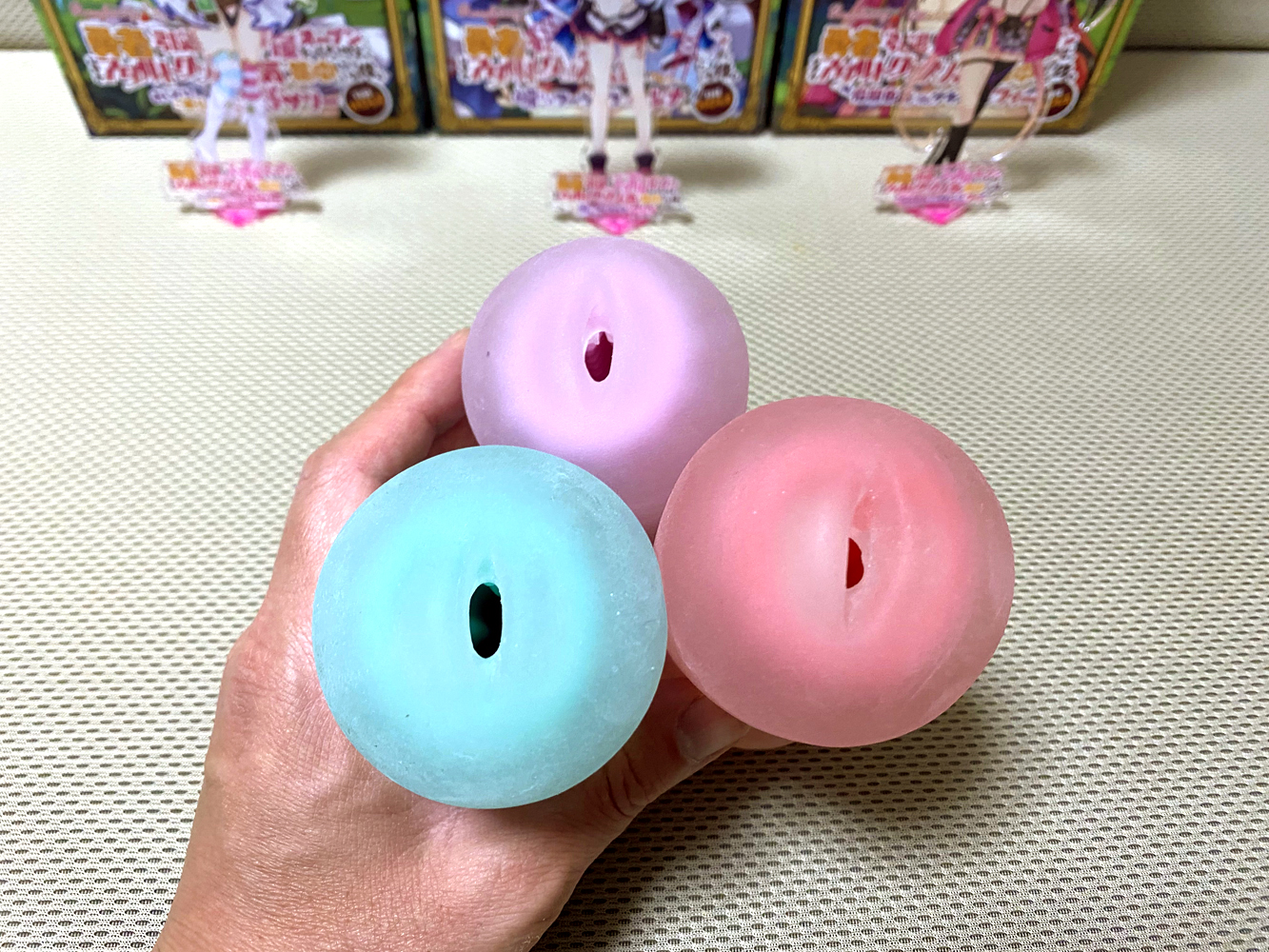 それでは肝心のオナホのレビューに移ろう。まず驚かされるのがそのビジュアル。3つとも半透明のスケルトン仕様になっていて、外郭から内部の構造が透けて見えるようになっているのだ。これがまたなろう系ファンタジーの“性具”っぽい魔術的雰囲気を醸し出していて、没入感を高めてくれる。それに色遣いもかなりヒロインの髪の色をモチーフにしたパステルカラーとなっており、造形も含めてキャラクターの可愛さを損なわいようにしつつ、絶妙に淫靡な雰囲気を醸し出しているのだ。