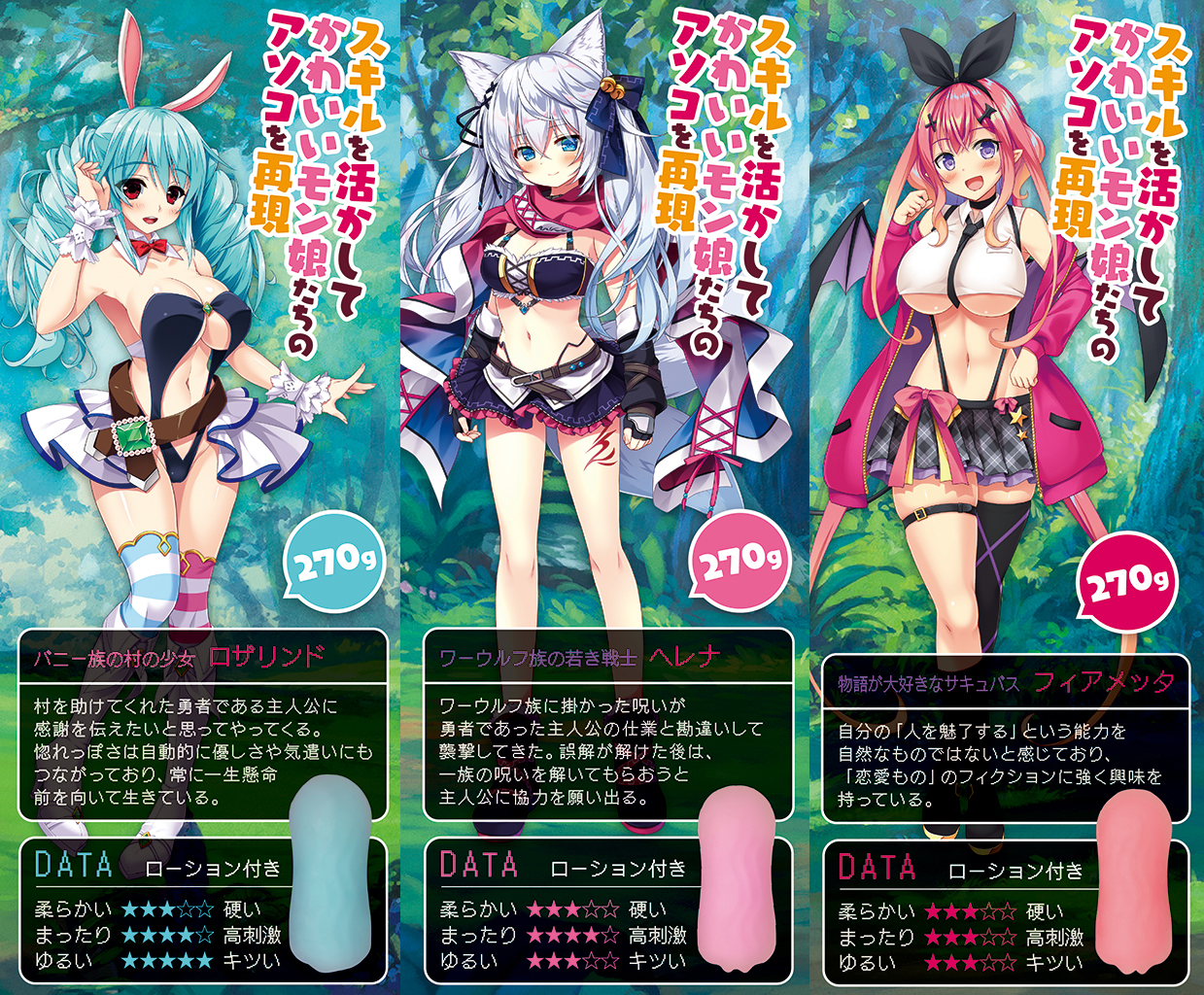 今回アイテム化されたヒロインは、呪われワーウルフ・ヘレナ、悩殺色気に悩むサキュバス・フィー、おしかけご奉仕バニー・ロザリーの3人。パッケージを見れば一目瞭然、全員なろう系ラノベから飛び出てきたような魅力的なヒロインたちで、「来期にアニメ化されるんですよ」と言われたら納得しそうなクオリティの高さ♥ そんな可愛いモン娘たちのアソコの具合を、じっくりたっぷり比べられるってんだからぁ、思わず股間から会心の一撃が出そうになっちゃうね!!