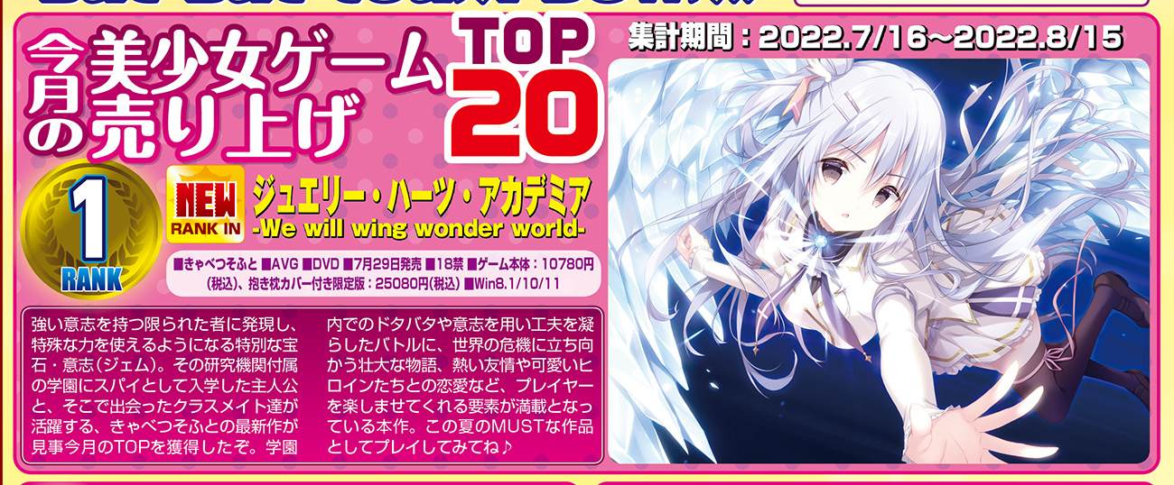 きゃべつそふとが満を持して放つ最新作『ジュエリー・ハーツ・アカデミア -We will wing wonder world-』が、堂々の1位を獲得。「意思(ジェム)」と呼ばれる宝石が発現し、能力を使えるようになった学生が集う学園を舞台に繰り広げられる学園ファンタジーAVGだ。物語性の高さやドキドキな展開で毎作大人気な冬茜トム氏が企画とシナリオを手掛け、一癖も二癖もあるクラスメイトたちとの熱い青春模様と冒険をたっぷりと楽しめるぞ。戦闘シーンにも力が入っており、シナリオゲー好きな人はもちろん、バトルモノが好きな人にもオススメ!!