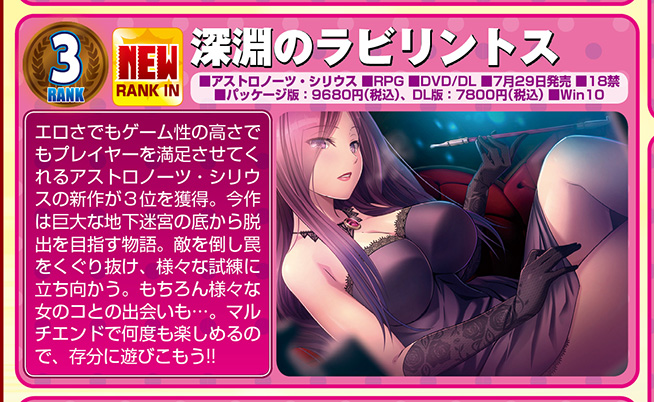 ゲーム性の高さで人気のアストロノーツ・シリウスの迷宮探索型RPG『深淵のラビリンス』が今月の3位にランクイン。全ての記憶を失った主人公が様々なイベントと試練をこなし迷宮の最下層から地上を目指すことになる本作は、戦闘スキル構築やランダムで構造が変化するダンジョン攻略の楽しさはもちろん、M&M氏が描く肉感溢れるヒロインたちとの濃厚Hも激シコクオリティなのだ♥