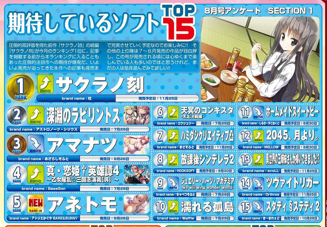 7月1日発売の『BugBug』8月号で聞いた「期待しているソフト」アンケート結果はこちら。今週末の9月30日(金)に発売されたタイトルでは、8位に『放課後シンデレラ2』(HOOKSOFT)、12位に『2045、月より』(MELLOW)がランクイン。どちらも公式HP公開直後から注目度が高くBugBugでも特集記事で大プッシュしてきた作品なだけに、売り上げ部門での上位進出に期待が高まるぞ。そして1位に輝いた枕の『サクラノ刻』は、明日10月3日(月)発売のBugBug11月号で巻頭14ページで大特集しているので、作品の魅力をたっぷりチェックしてほしい!!