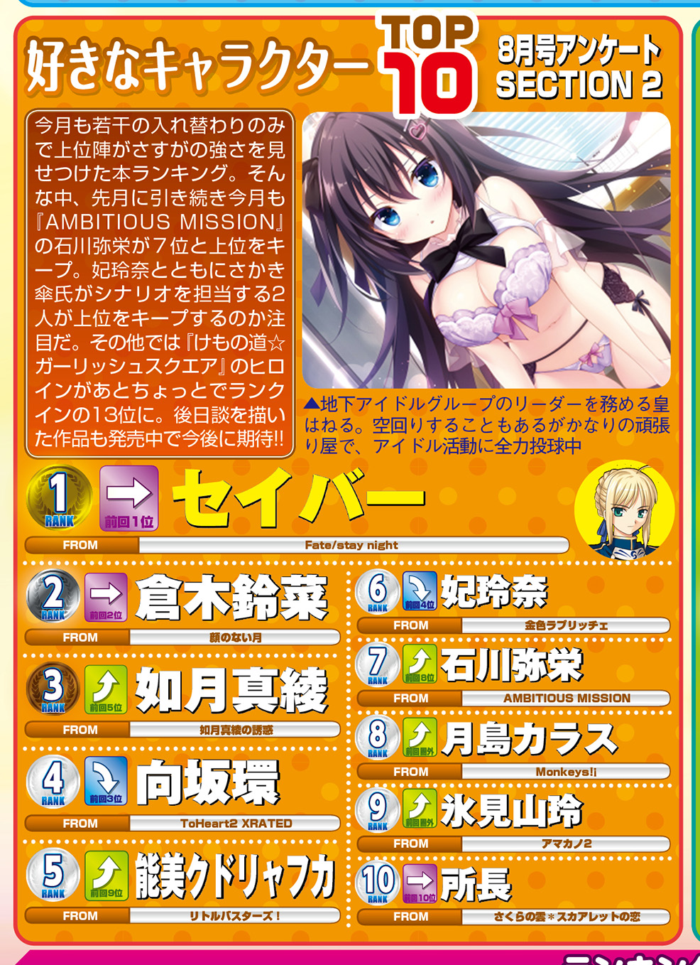 「好きなキャラクター」ランキングは、今月もセイバーが圧巻の1位。安定した人気を誇る上位陣だが、先月に引き続きSAGA PLANETSの『AMBITIOUSU MISSION』のヒロイン・石川弥栄が今月も7位と大健闘。同じくSAGA PLANETSのタイトルで6位にランクインしている『金色ラブリッチェ』の妃玲奈と共に、上位の常連になることに期待ができるのか注目だ。