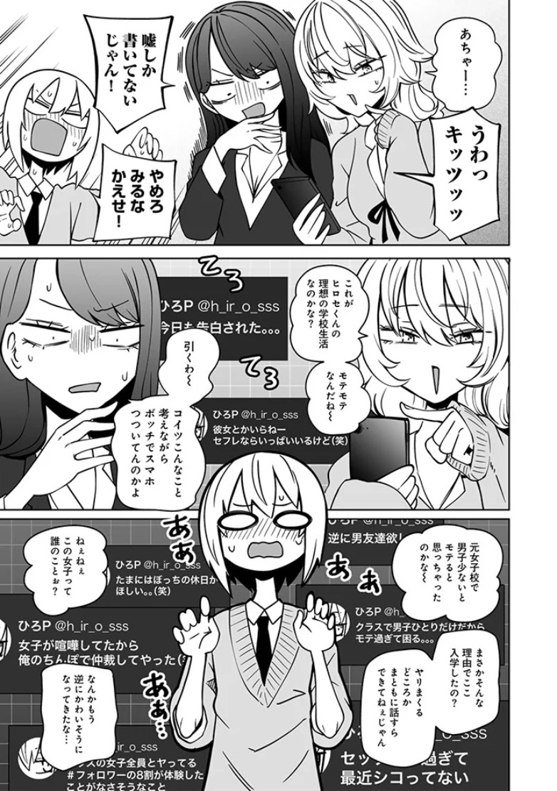 ▲男子から虐められている美祢田を罵倒するクラスメイトのチサト。オナニーでストレスを発散するチサトの抱く感情は…?